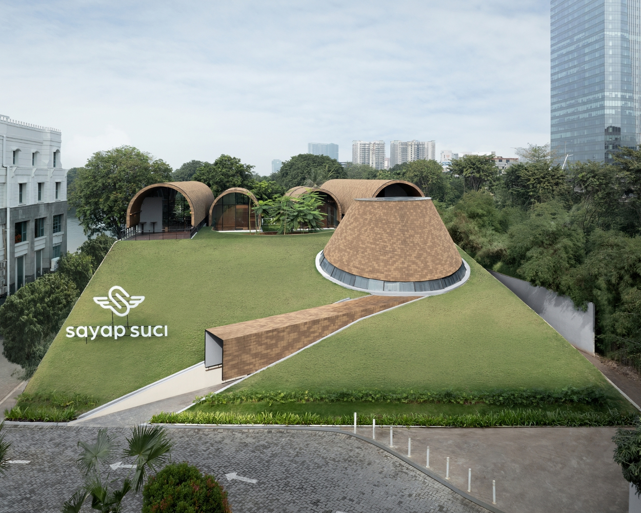 Переосмыслив гибкий, постоянно развивающийся прототип третьего пространства, объединяющий природу, архитектурная студия RAD+ar создала атмосферу, которая позволяет посетителям ресторана окунуться в извилистые многоосевые пространства, затенённые широкой зелёной крышей, что позволяет им отдохнуть от тропической жары Индонезии. Зелёная крыша спроектирована с наклоном назад, создавая дополнительные отступы и изломы, которые облегчают циркуляцию воздуха и соединяют передний бульвар с городским озером сзади.