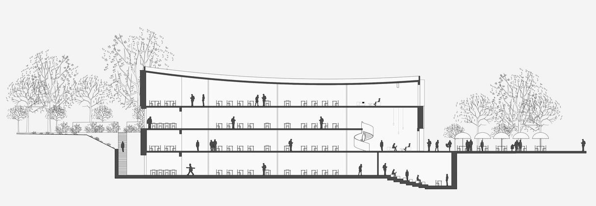 Его простой и понятный объём повторяет морфологию объекта: вытянутый параллелепипед с крышей в форме вогнутой кривой. Его чёткие линии служат дефисами, соединяющими город, парк и другие объекты университета. Массивный камень на фасаде был добыт в местных каменоломнях, чтобы перекликаться с местными памятниками, имеющими аналогичную материальность, и усилить его узнаваемость на территории.