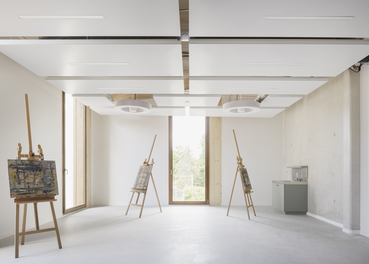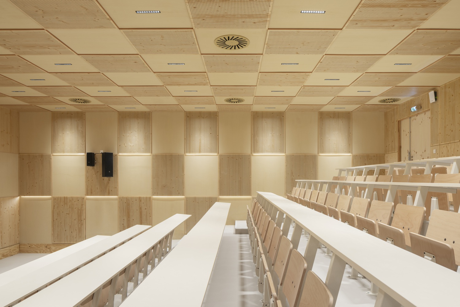 Конструкция из стоек и балок с лёгкими и легко трансформируемыми перегородками обеспечивает адаптивность и обратимость здания, что облегчает интеграцию с меняющимися требованиями и организацией. На первом этаже, соединённом с общественным пространством и внешним ландшафтом, находится школьный вестибюль. Два уровня этого зала простираются под обширным открытым пространством с привлекательной сигнальной винтовой лестницей, ведущей в классные комнаты на верхних этажах.