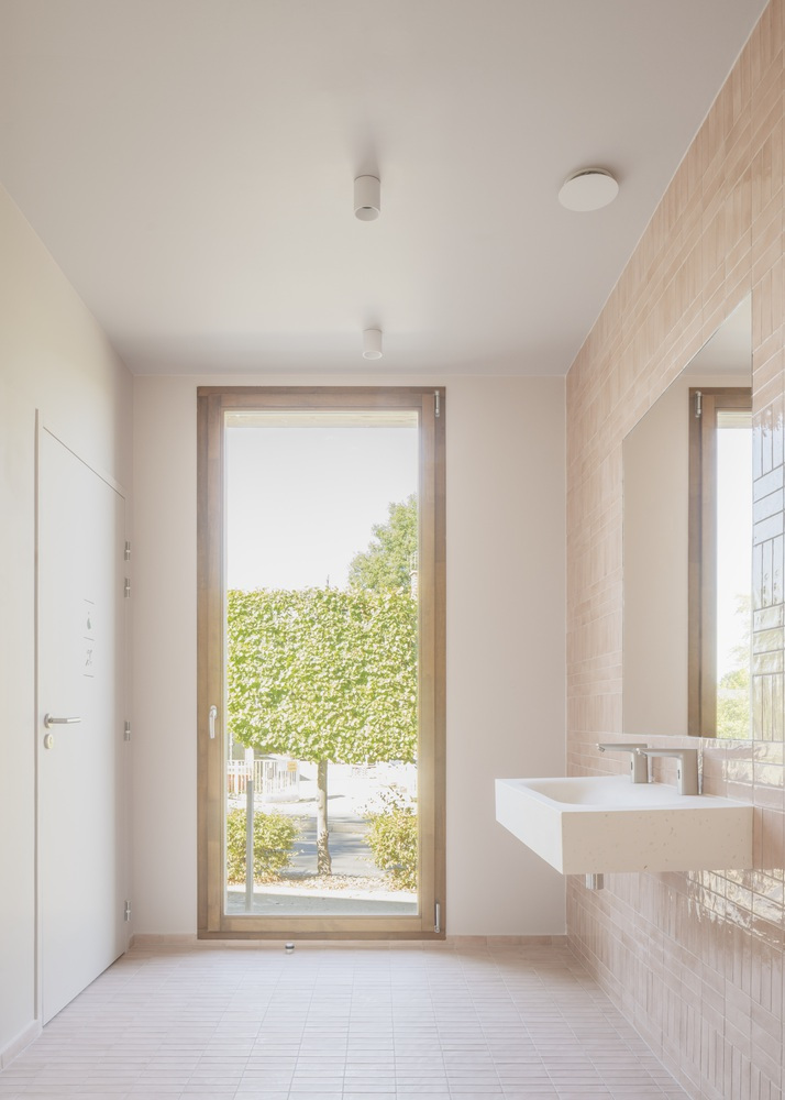 Все фасады были выполнены с одинаковым вниманием и элегантностью. Они выполнены в правильном шахматном порядке, чередуя оконные ниши с каменными и деревянными рамами. Эта логика модульности и укладки камня в штабеля позволяет создать простую, эффективную и компактную архитектуру. Простота материалов фасадов основана на правильной сетке, вариации глубины которой и чередование прозрачности и непрозрачности оживляют фасады.