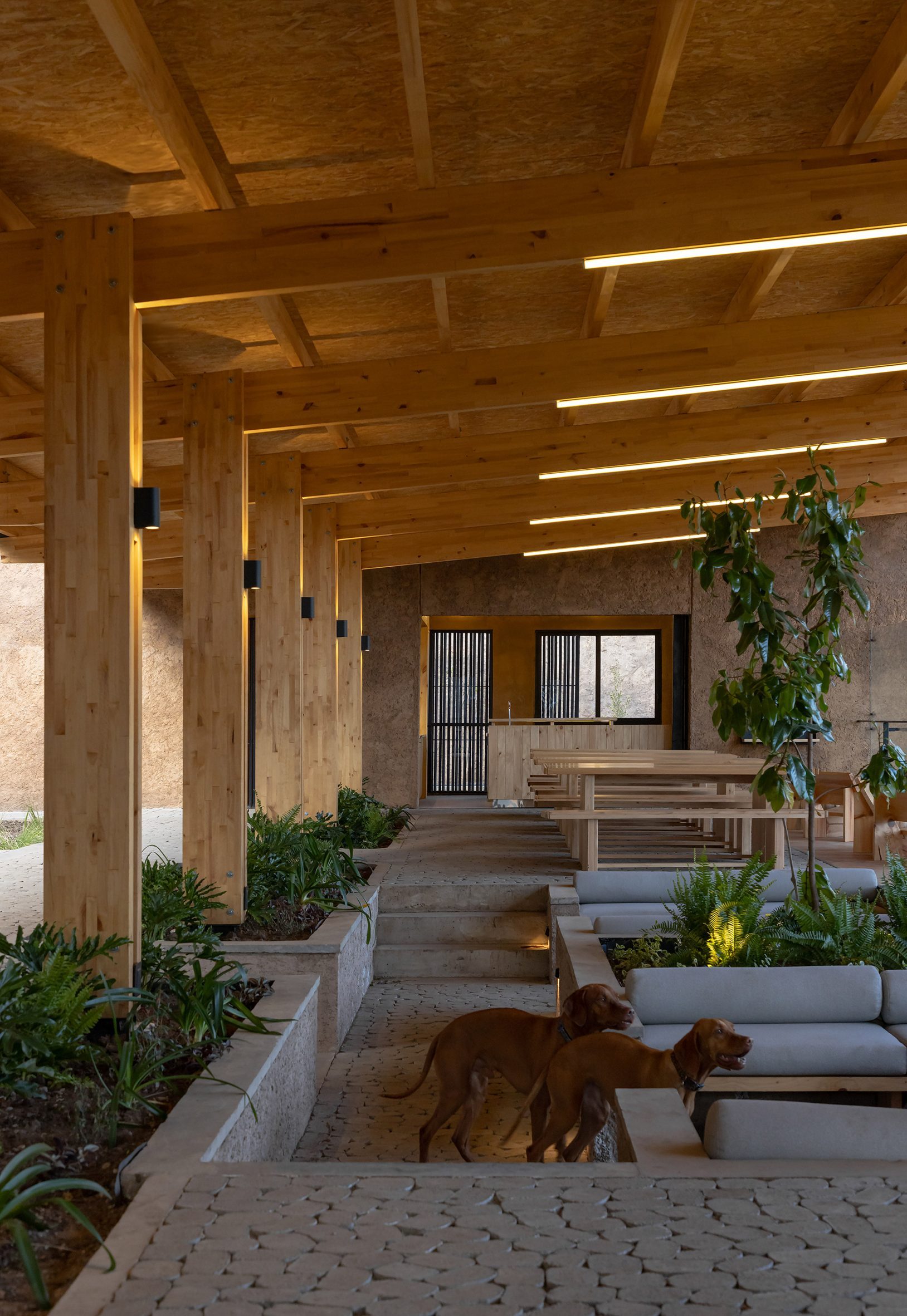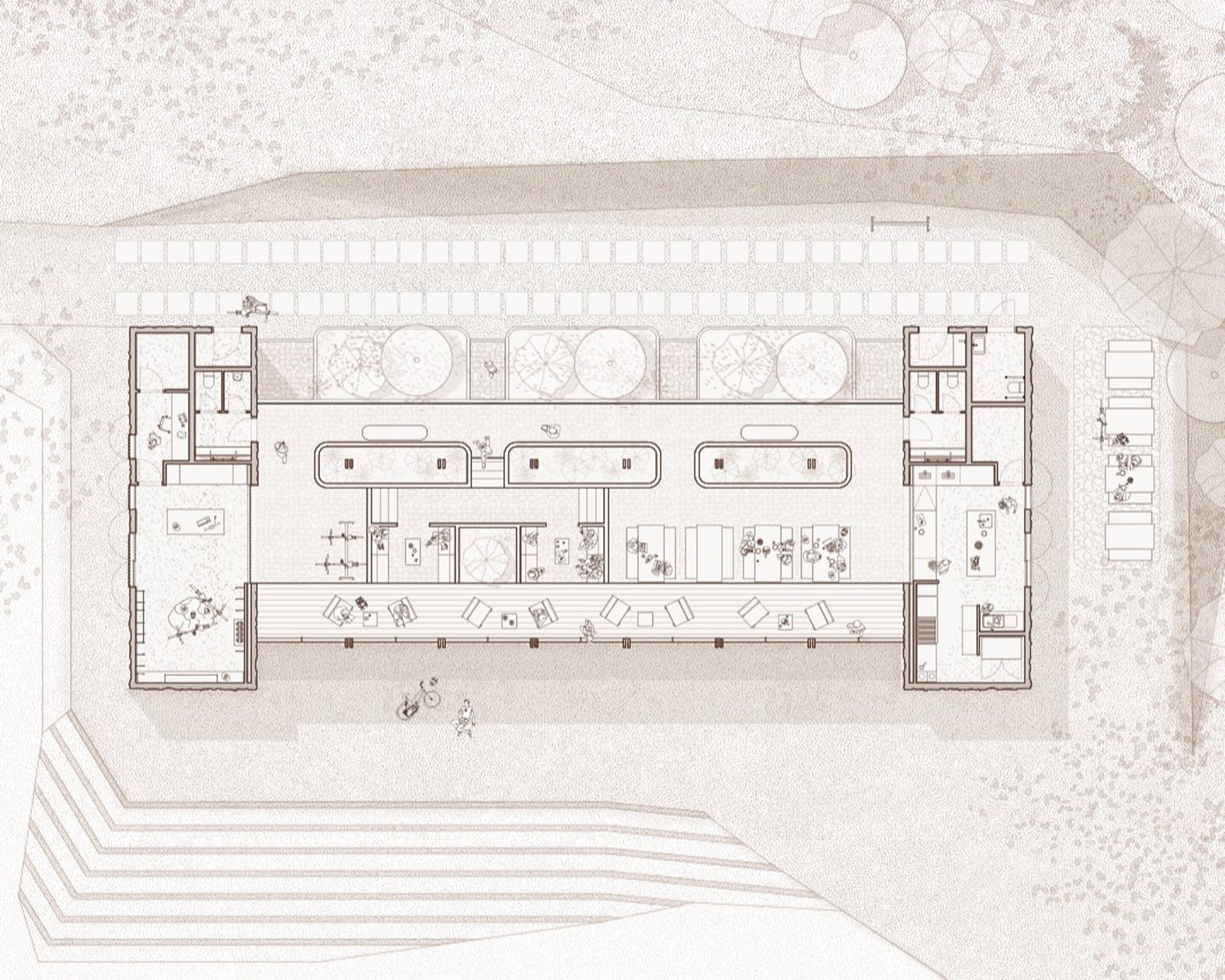 Бетонные блоки по обеим сторонам — в одном из них находится зона ресепшена и веломагазин, а в другом — небольшое кафе-ресторан — обрамляют центральную зону отдыха со столиками для пикника, клумбами и утопленными в землю местами для сидения. Пигмент землистого оттенка на бетоне подчёркивает связь убежища с землёй, а проёмы с металлическими рамами наполняют сдержанные внутренние пространства естественным светом.