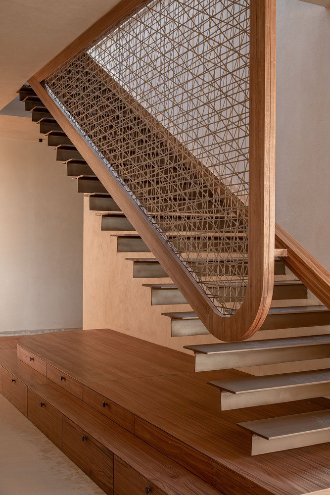 Внутри пространственная текучесть организована вокруг центрального ядра, в котором расположены вертикальные циркуляционные и технические помещения. Лестница, скульптурная и деконструированная, кажется отделённой от стен; каждая ступенька встроена в массив, в то время как подвесные перила изящно парят, подчёркивая вертикальность пространства.