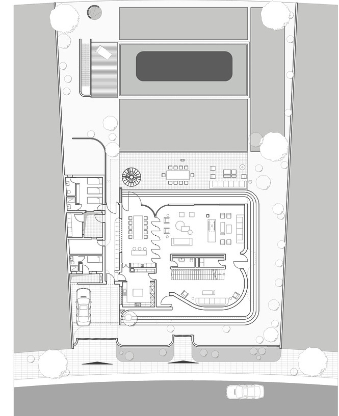 Дом, выходящий окнами на улицу, остаётся защищённым. Его фасад, непрозрачный и сдержанный, украшен изящными проёмами, завешенными тонкими терракотовыми планками, которые пропускают западный свет и сохраняют приватность. Вход происходит через щель между двумя изогнутыми стенами, порог, промежуток, момент перехода.