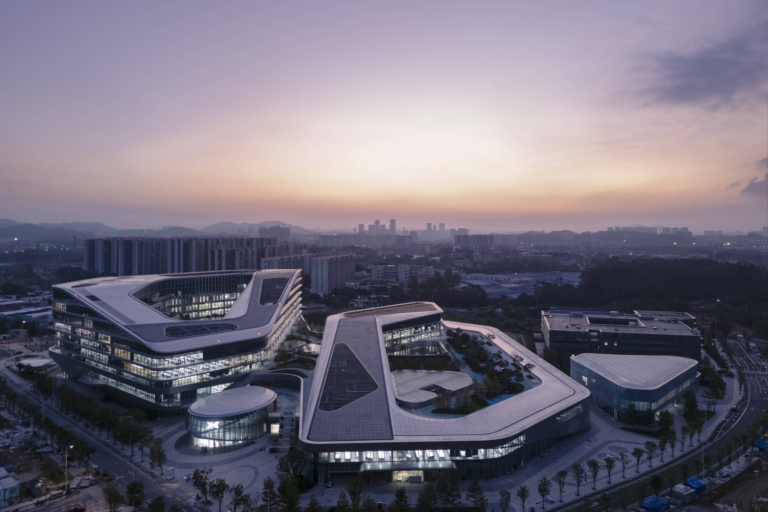 Относительно независимые объекты, расположенные за пределами основных зданий, включают флагманский магазин XPENG, общий конференц-центр и площадку для взлёта и посадки летающих автомобилей, что превращает весь комплекс в поистине крупномасштабный технологический центр с полноценной промышленной экосистемой. На крыше установлены зелёные фотоэлектрические системы, спортивные сооружения, открытая посадочная площадка для самолетов и пейзажи набережной, образующие богатое открытое пространство, интегрированное с городом.