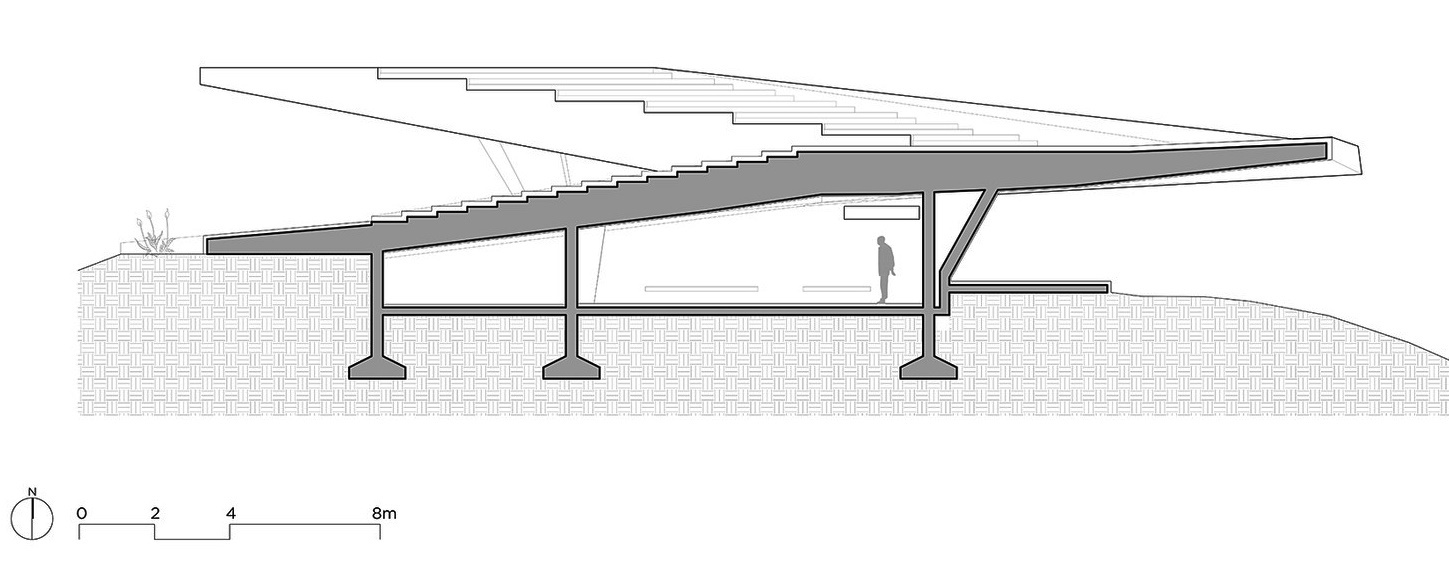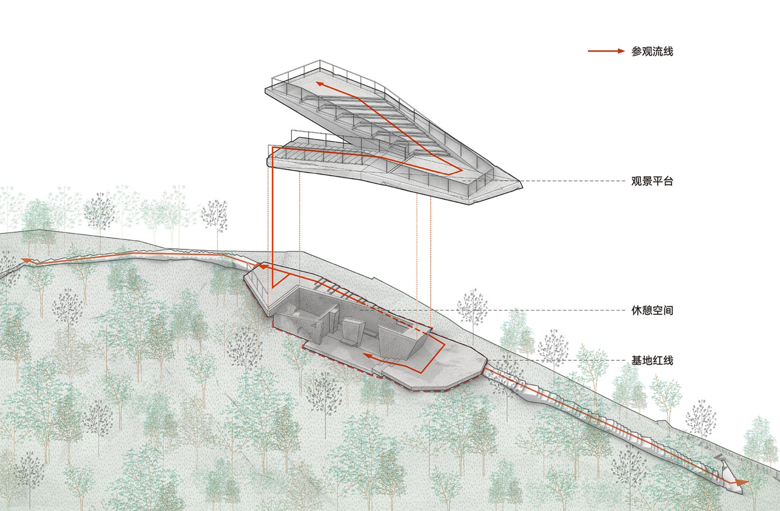 В проекте используется малозатратный, "деархитектурализованный" подход. Трёхметровый котлован, оставшийся после предыдущих работ, был перепрофилирован для размещения основных сервисных функций, что уменьшило необходимость в новых раскопках. Над ним был создан единый структурный объем - "искусственный камень", который органично вписывается в горный хребет и продолжает визуальный язык окружающих скальных образований. Такая конфигурация сохраняет непрерывность существующих пешеходных маршрутов, обеспечивая при этом возвышенную смотровую площадку.