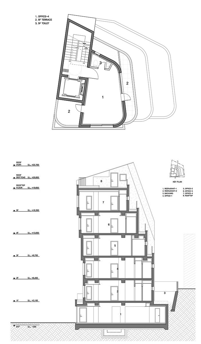 Северная сторона участка граничит с прилегающим участком на возвышенности, что накладывает ограничение по высоте из-за правил дневного света, направленных на север. Чтобы сделать необходимый откос, который не виден спереди, заметным с главной дороги, архитекторы применили конструкцию, при которой массы постепенно выступают вперёд от 3-го этажа вверх. Эта композиция была задумана для того, чтобы создать ощущение напряженности и динамизма на фасаде здания, если смотреть с обочины дороги.