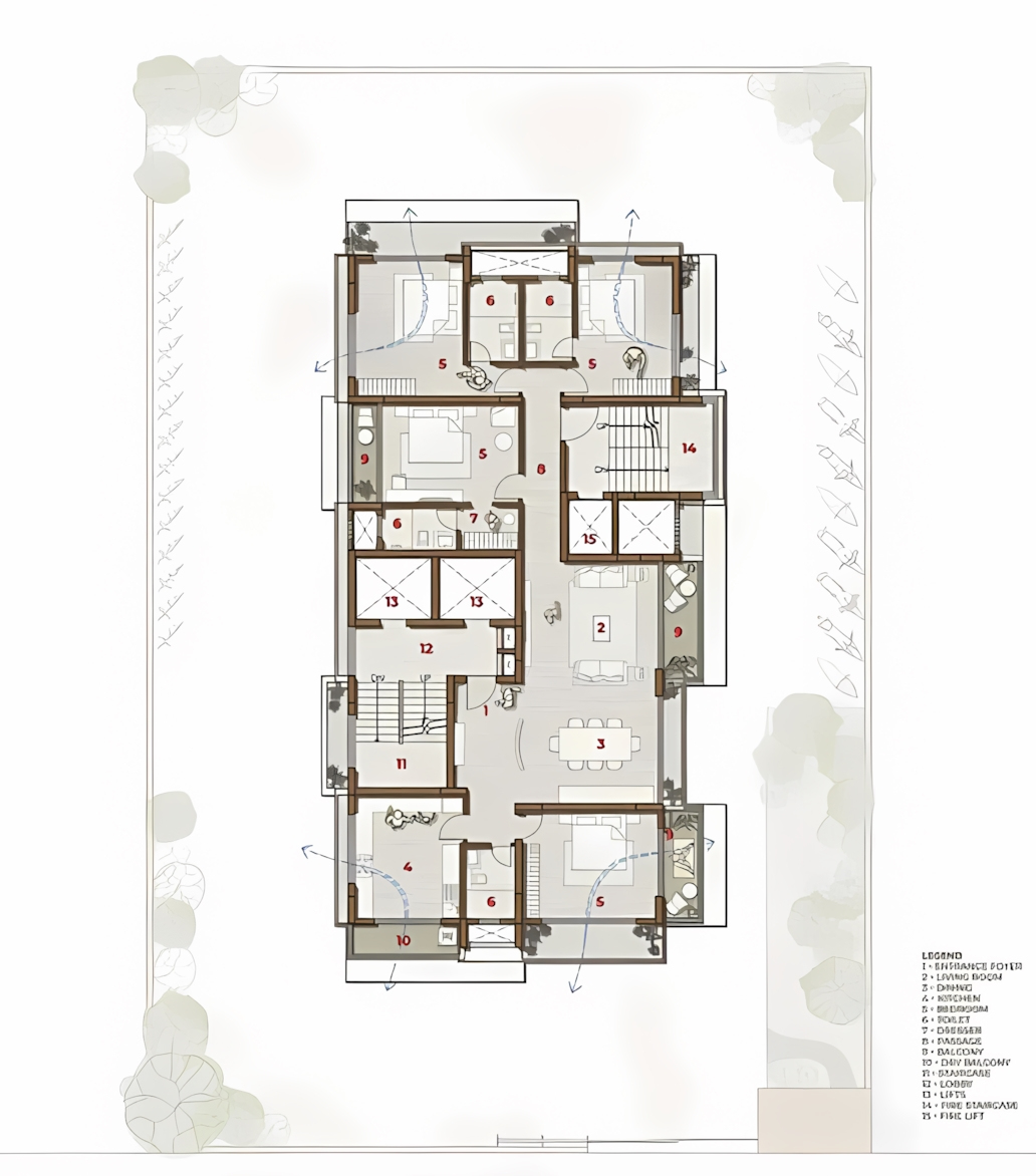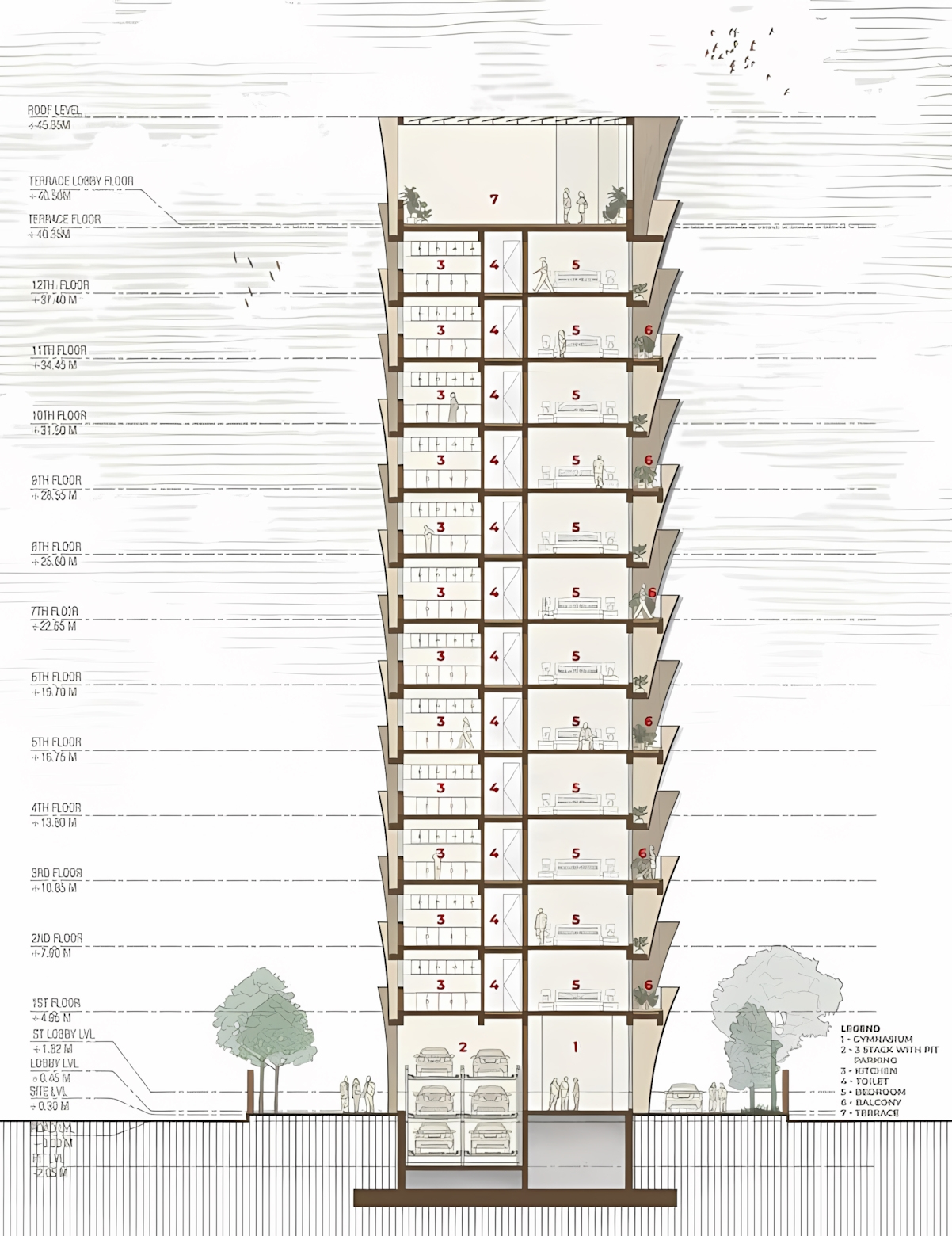 Обязательные открытые пространства со всех сторон обеспечивают площадь застройки всего 270 м2 на каждом этаже. В этом 12-этажном здании на каждом этаже запланирована отдельная квартира с 3 спальнями. 3 спальни расположены на 3 углах, а кухня образует 4-й угол, что облегчает перекрёстную вентиляцию в каждой комнате.