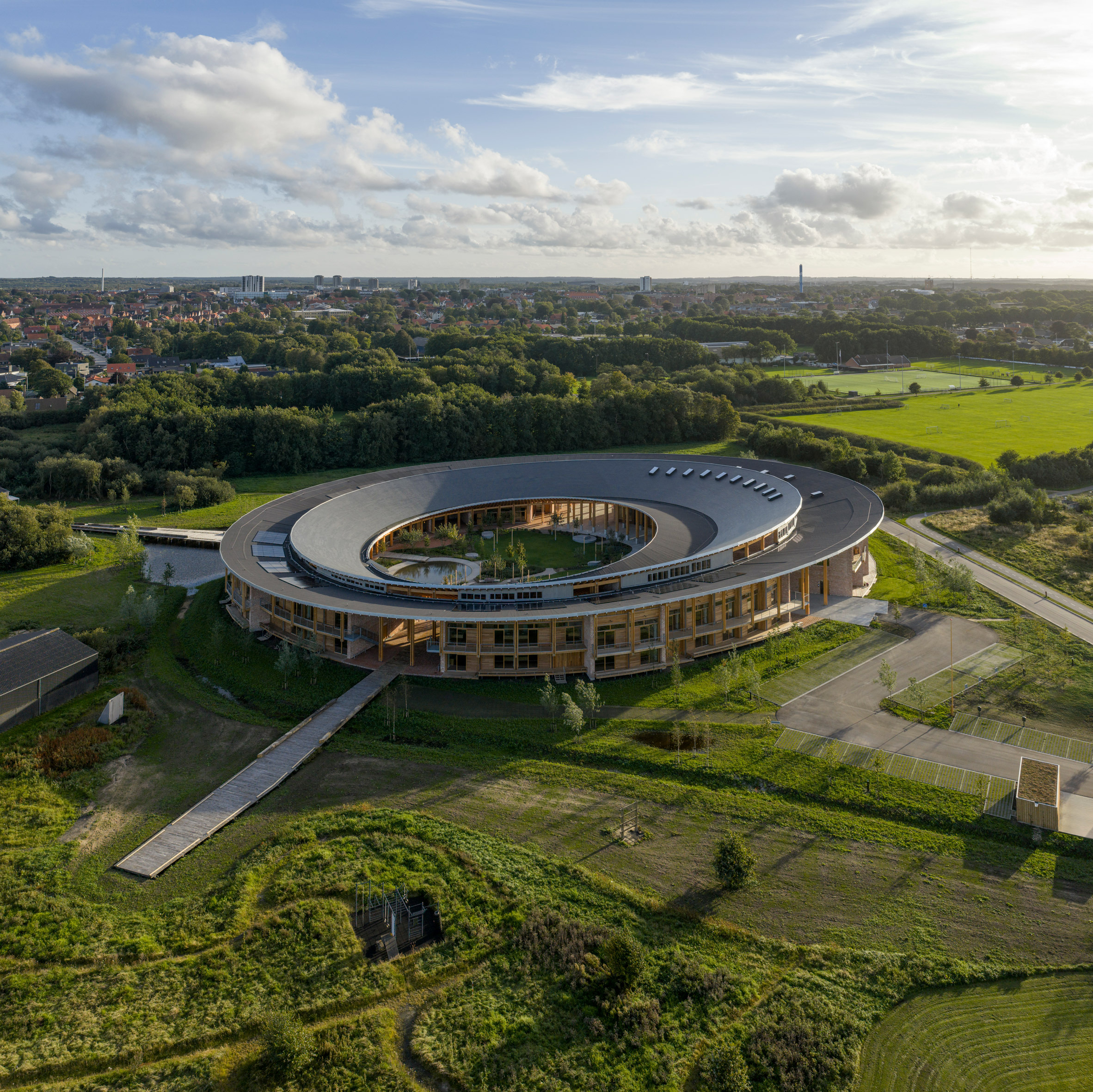 Датская студия Dorte Mandrup использовала палитру из необработанного кирпича и древесины для создания эллиптической формы Колледжа ремёсел в Хернинге, который предназначен для начинающих ремесленников в Дании. Колледж на окраине Хернинга - второй из трёх колледжей, которые некоммерческая организация Fonden for Håndværkskollegier планирует открыть по всей Дании при финансовой поддержке компании по продаже недвижимости BRFfonden, чтобы повысить интерес к ручным профессиям и расширить опыт в этой сфере. Колледж ремёсел, расположенный в большом эллиптическом кольце, опоясывающем общий двор, предлагает доступное жилье и учебные помещения для семидесяти начинающих ремесленников.