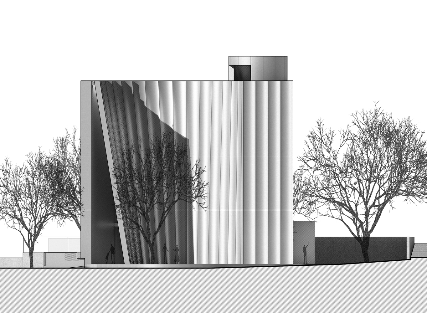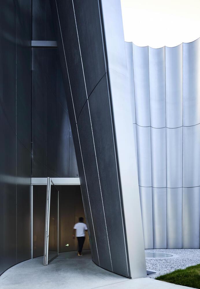 Обращённая к реке и прилегающая к главной городской артерии сторона здания, обращённая к городу, "раскрыта", создавая одновременно независимую и открытую оболочку. Весь фасад облицован изогнутыми панелями из нержавеющей стали. Этот дизайн использует присущее материалу натяжение, устраняя необходимость во внутренних прогонах, что создаёт чистую, ритмичную эстетику.