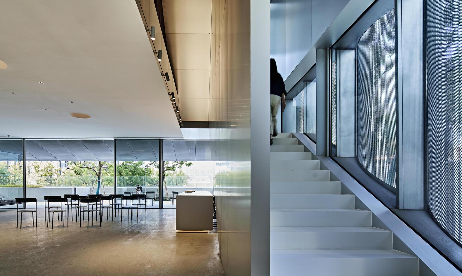 Первый этаж выходит окнами на север, соединяясь с консольной платформой, что стирает границы между зданием и городом. На углу здания все три надземных уровня соединены вертикальным проёмом, который не только устраняет неловкость оригинального остроконечного пространства, но и создаёт духовную атмосферу, поскольку свет нисходит сверху.