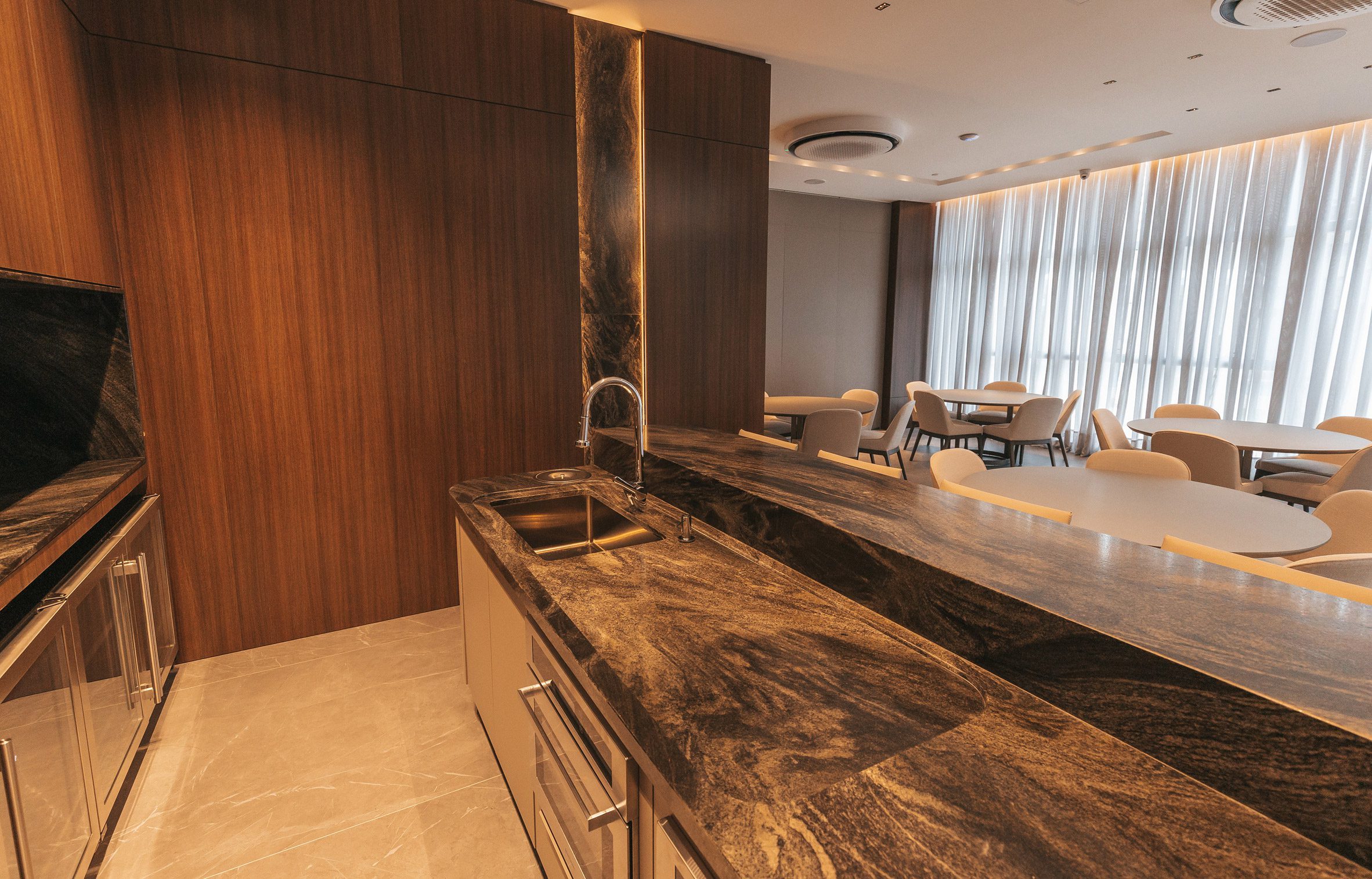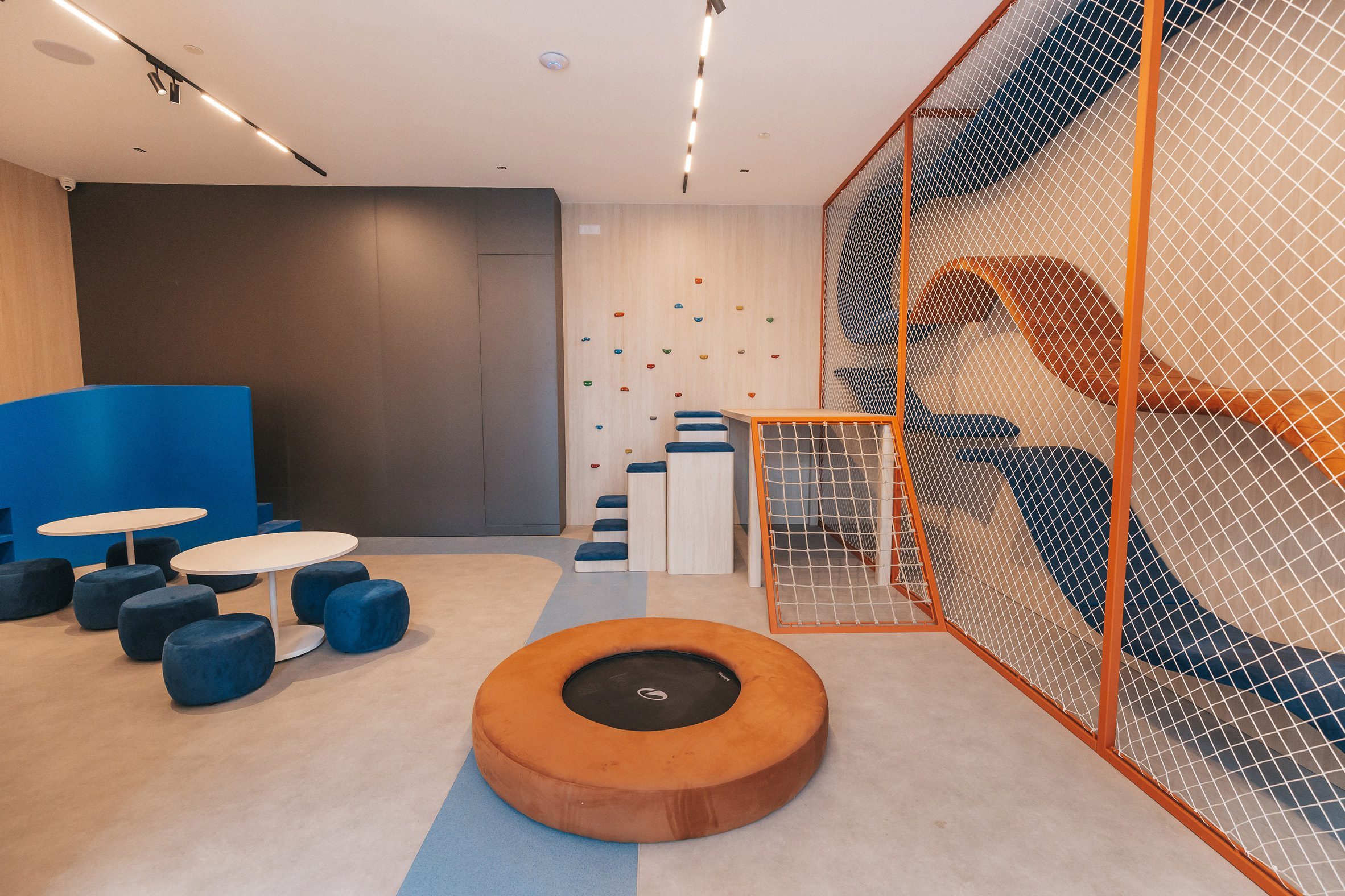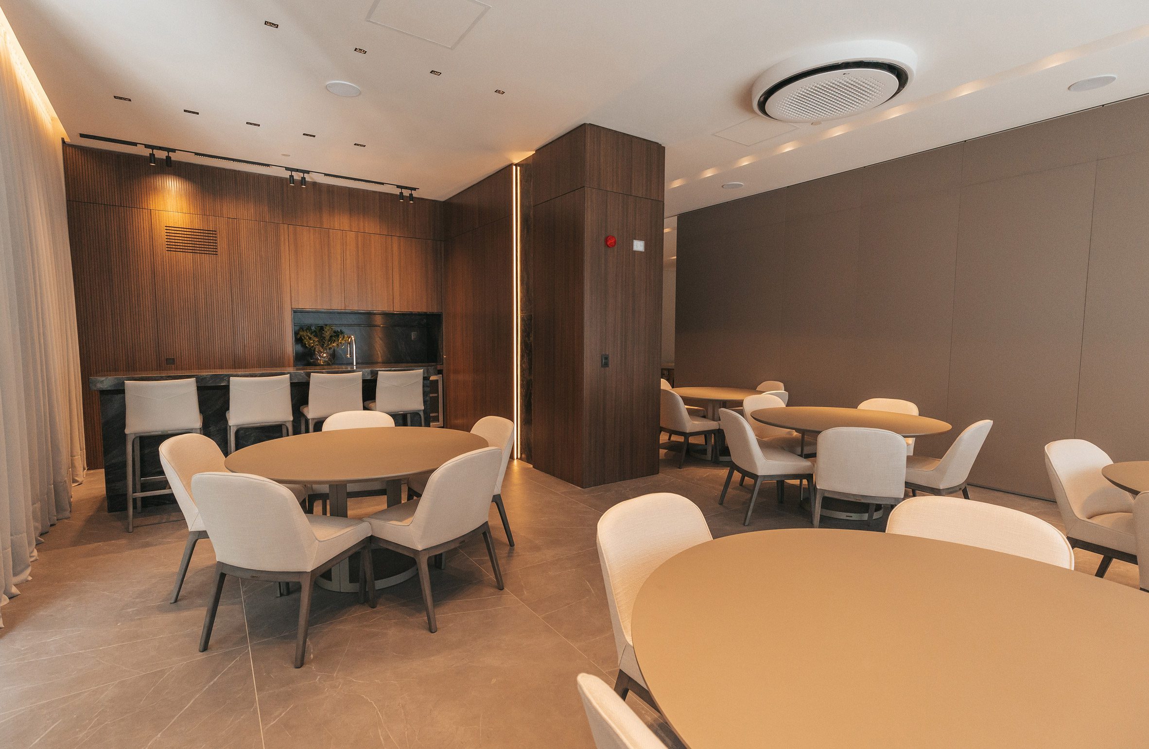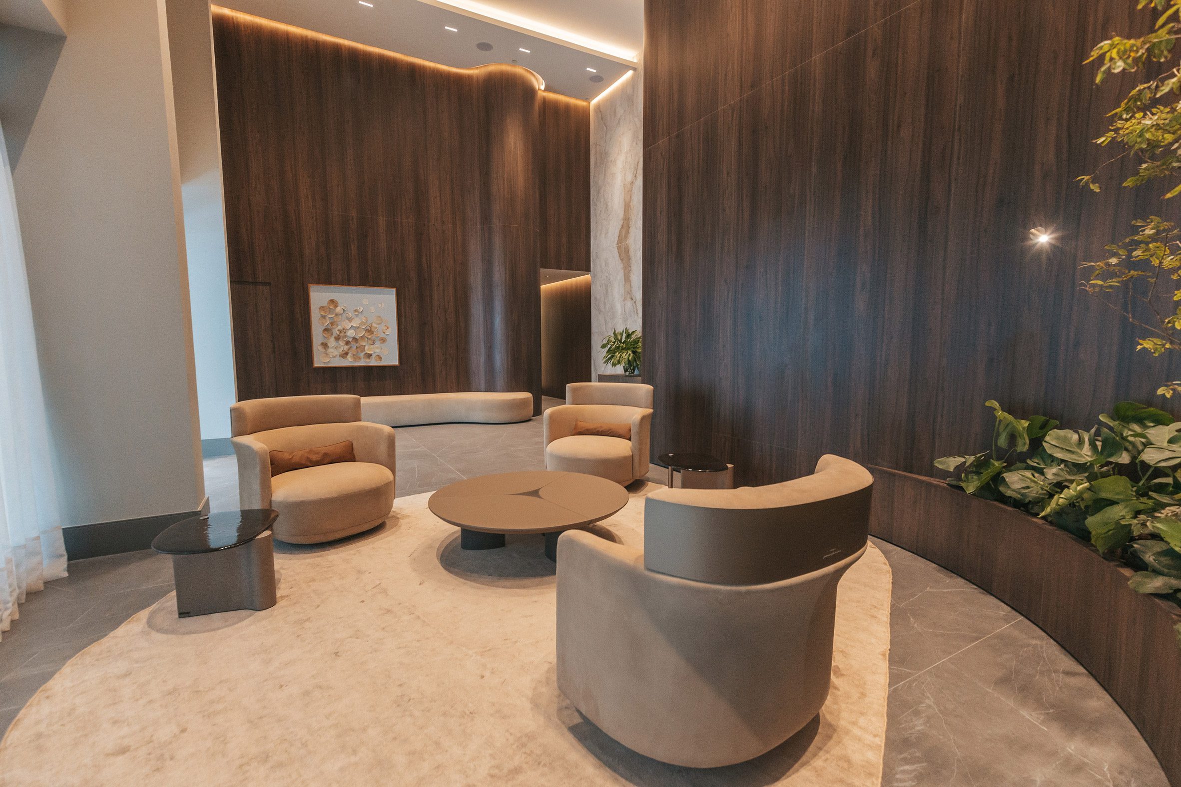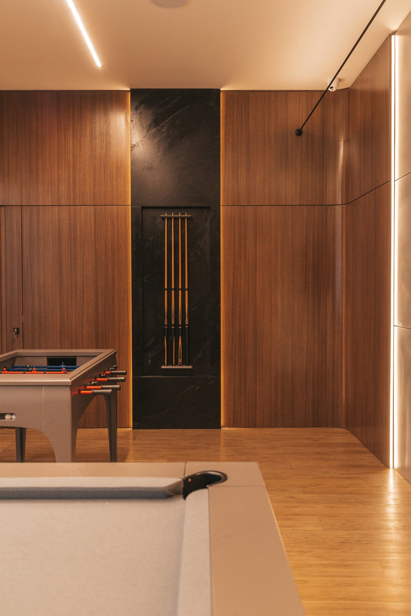 Интерьер вестибюля жилого комплекса в основном выполнен из тёмного дерева. Среди удобств — тренажёрный зал, игровая зона и закрытый домик у бассейна.