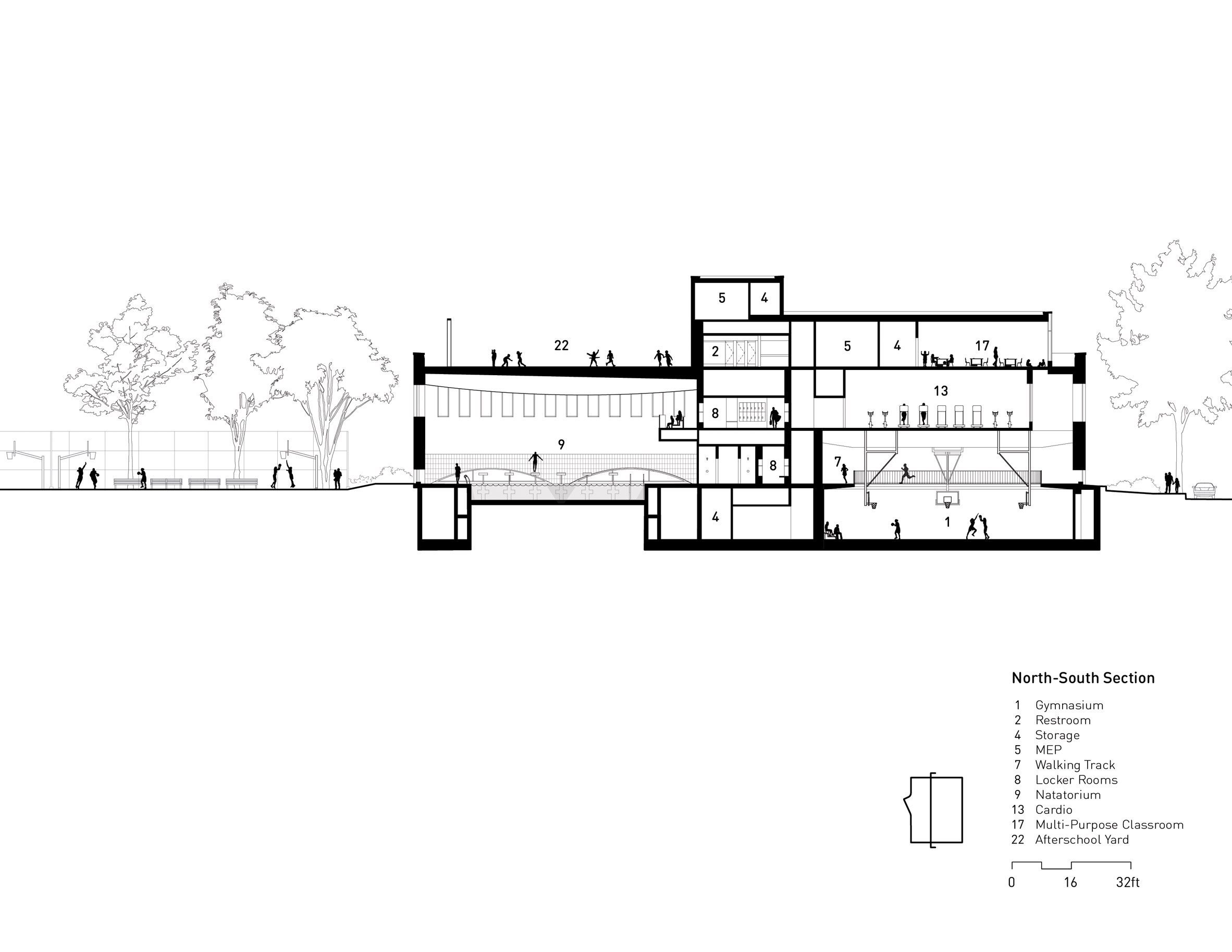 Большие арочные окна, врезанные в плавно изогнутый кирпичный фасад, подчёркивают гостеприимство здания и наполняют его естественным светом и видами. Внутри здания расположены двухуровневый спортивный зал и бассейн по обеим сторонам здания. Между двумя большими помещениями расположены небольшие пространства для кабинетов персонала, раздевалок, танцевальных студий, силовых и кардиотренировочных залов.