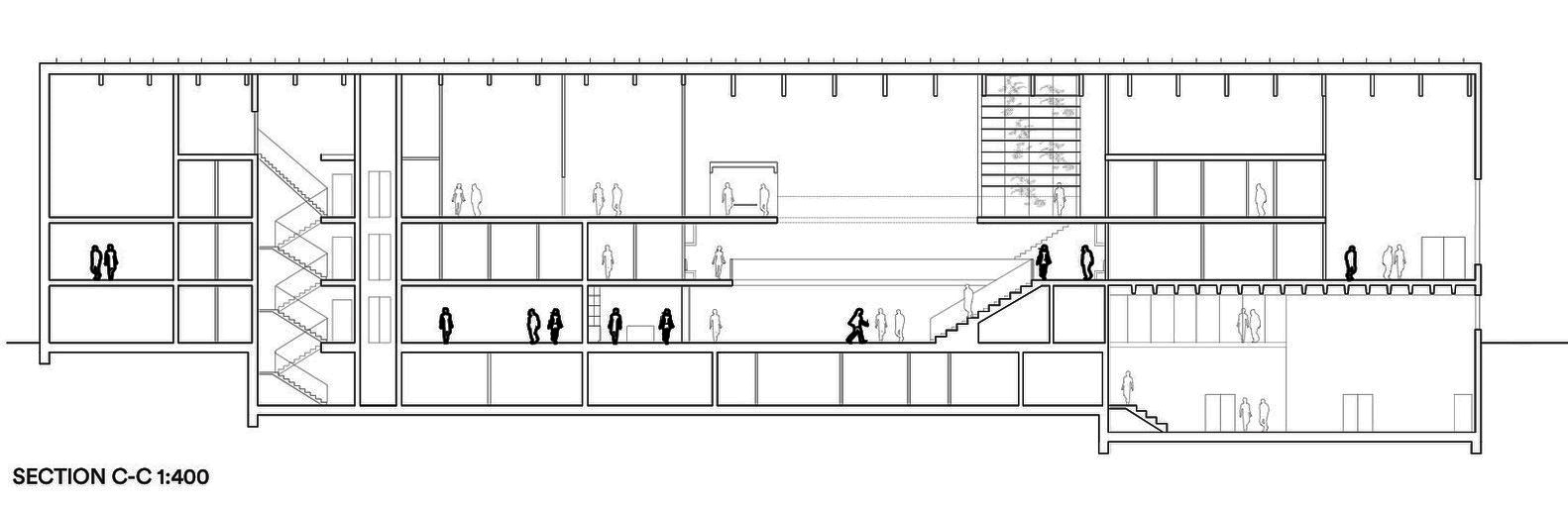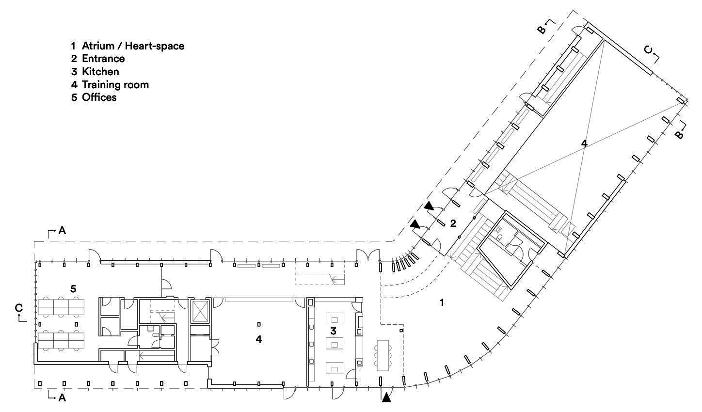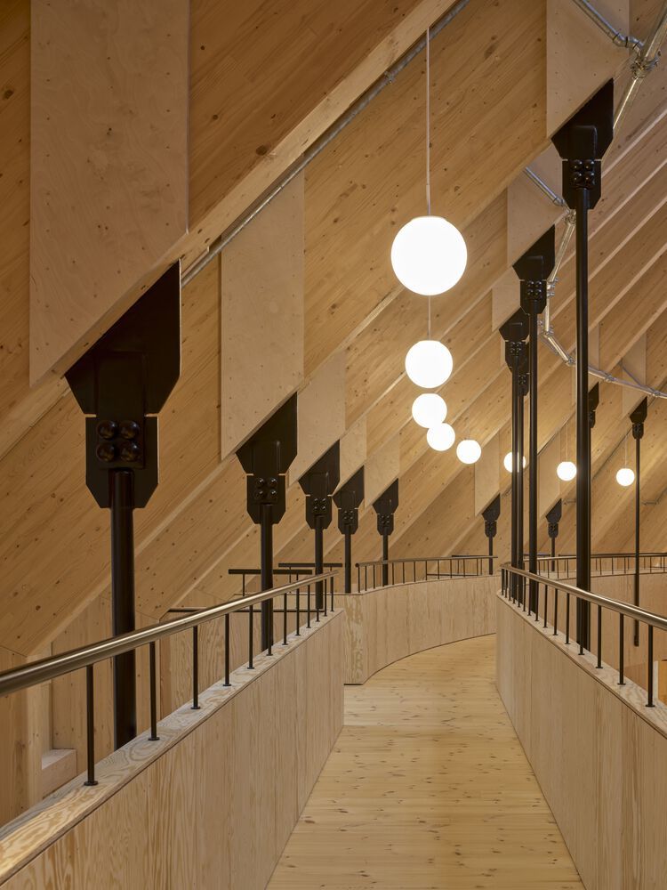 Большая деревянная лестница со встроенными креслами образует место встречи в центральном атриуме, где люди могут собираться и взаимодействовать друг с другом, что позволяет проводить спонтанные мероприятия и социальные встречи. Внутренние помещения освещаются мягким естественным светом, проникающим через большие окна на фасаде и крыше, которые постоянно дарят новые впечатления в течение всего дня.