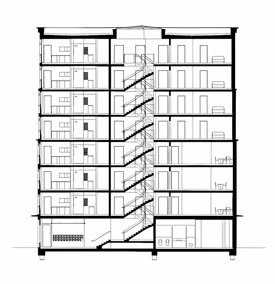 Здание имеет просторные размеры и спроектировано по высоким стандартам, что необычно для здания, в котором в основном располагается социальное жильё. Обновление этих мест общего пользования было вдохновлено высотным жилым зданием Альвара Аалто в бременском районе Вар.