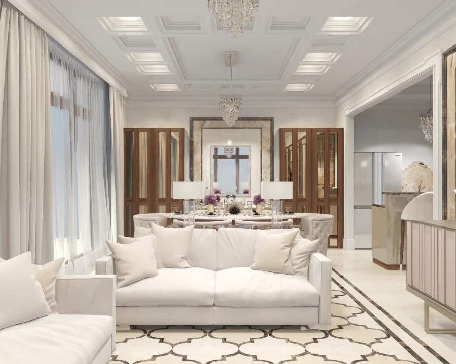 Гостиная объединяет в себе сразу три зоны: кухню, столовую и зону для отдыха и общения. Потолок украшен кессонами. Акцентна стена задекорировна мраморными слэбами. Пол облицован паркетной мозаикой. Пространство визуально расширено с помощью зекральных поверхностей.
