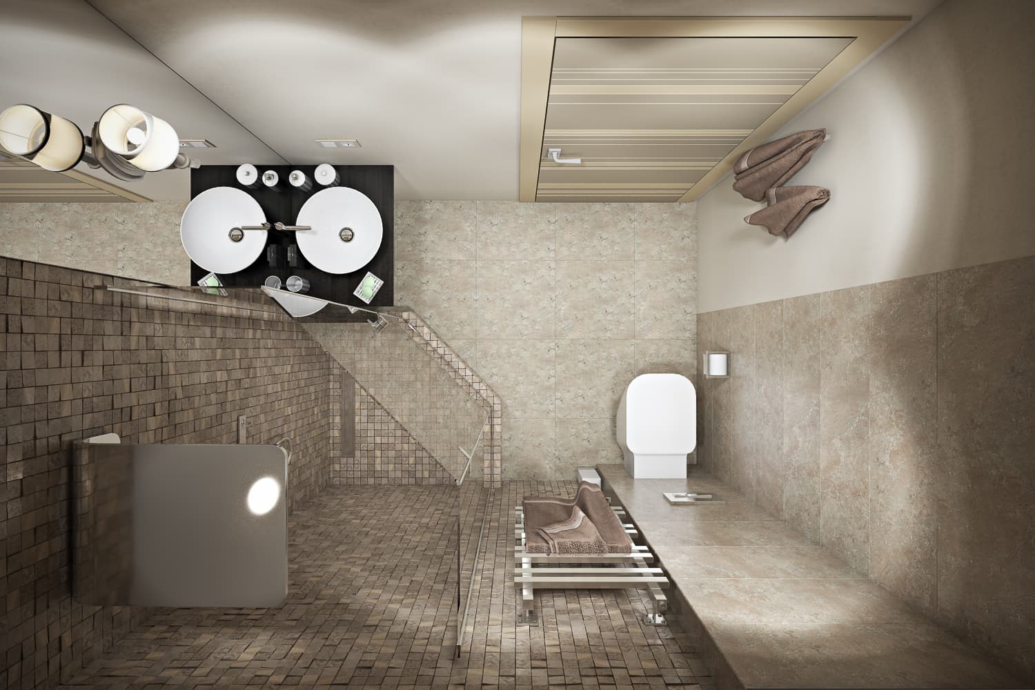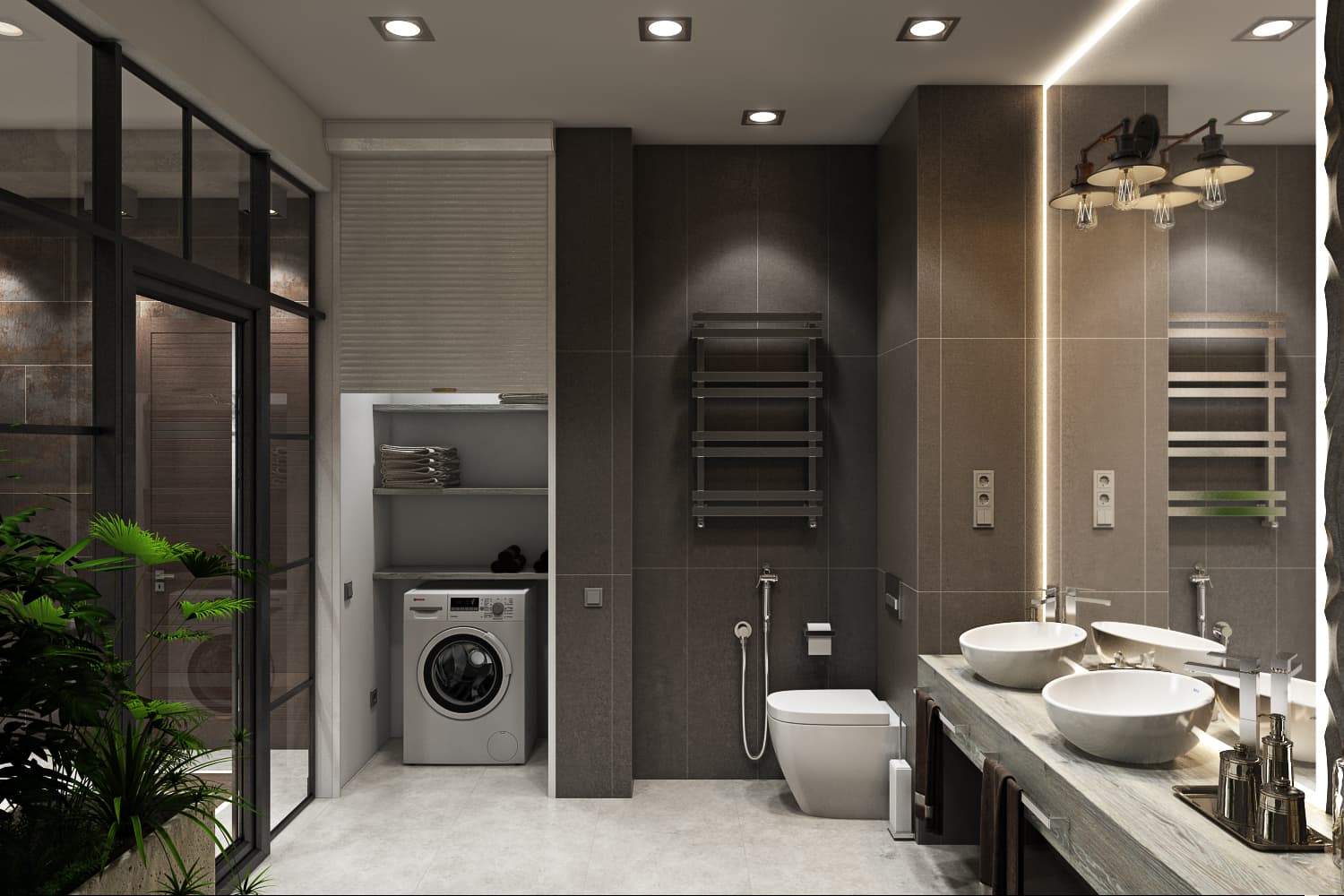 Стильная ванная комната со стеклянной стеной (используется «умное» стекло). Предусмотрена отдельностоящая ванна, столешница с двумя раковинами, унитаз с инсталляцией, зеркало со встроенной подсветкой, цветник.