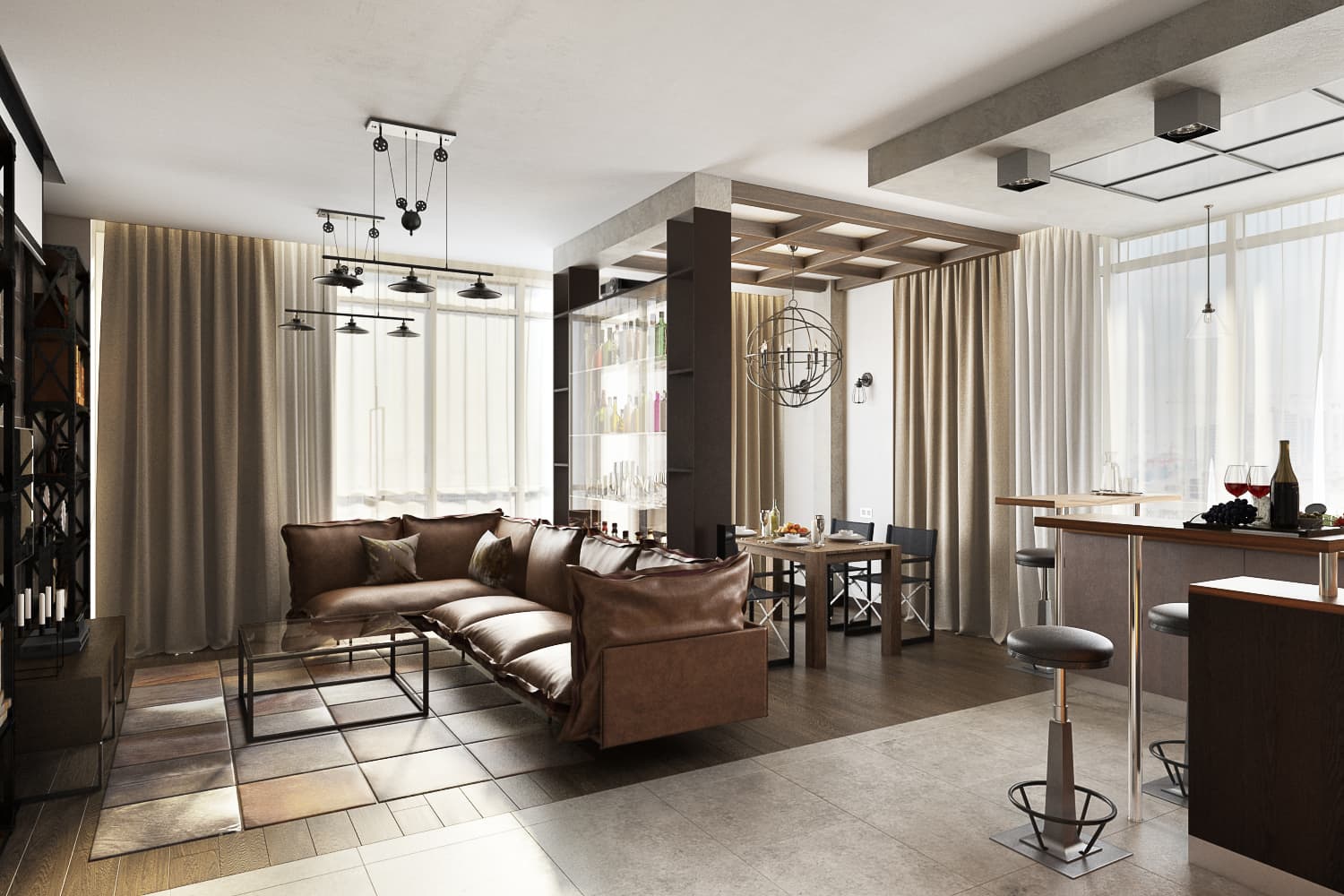 Объединенная кухня-столовая-гостиная с элементами стиля «лофт». Несмотря на то, что основным отделочным материалом является керамогранит, помещение не выглядит холодным и нежилым. Отделение зоны гостиной от столовой выполнено светопрозрачным застекленным стеллажом, исполняющим функцию бара.
