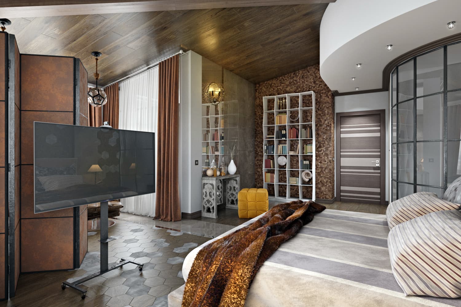 Спальня в современном стиле с элементами ар-деко с камином. Изголовье кровати выполнено из кожаных панелей до потолка. Одна из стен отделана керамогранитной плиткой «под камень».