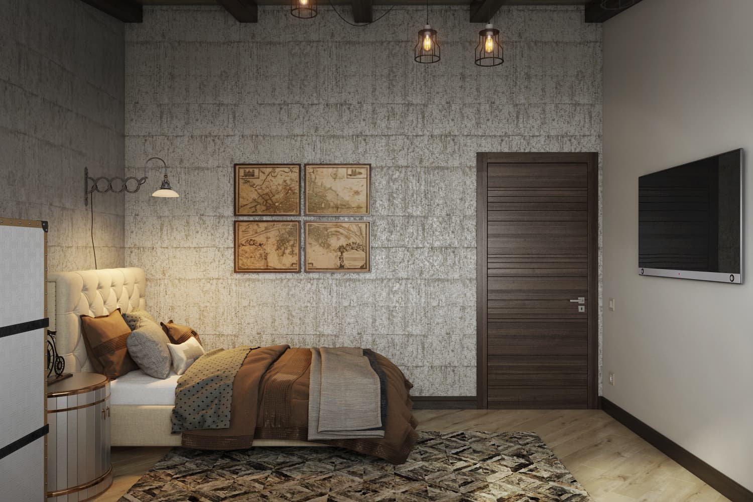 В отделке главной спальни применены такие материалы, как керамогранитная плитка, зеркальные вставки, мозаика, инженерная доска, деревянные панно со вставками из бетона. За счет многообразия материалов, а также скошенного потолка, комната получилась очень интересной.