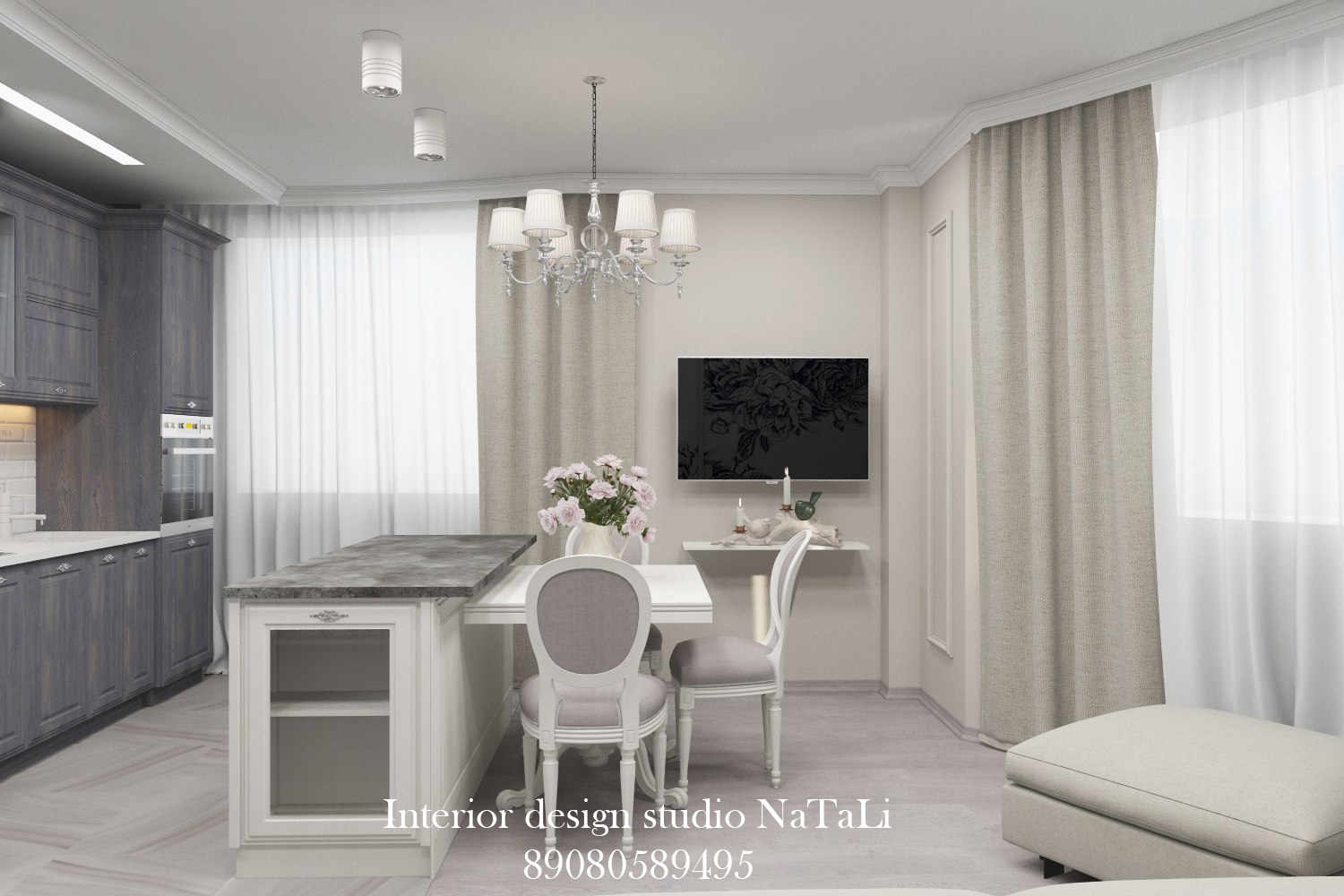 Объединенная кухня-гостиная в серо-бежевых оттенках. Однорядный гарнитур серый, классический, с филенкой. Плитка фартука на рабочей поверхностью имитирует кирпичную кладку. Кухонный стол вынесен как остров и визуально отделяет зону кухни от зоны гостиной. С обратной стороны кухонного стола — миниатюрный обеденный столик на 2-3 человека. В гостевой зоне имеется только диван и широкий пуф. Вместо тумбы под ТВ открытая полка белого цвета. Акцентная стена в гостевой зоне украшена молдингами и росписью — темно-синие розы.