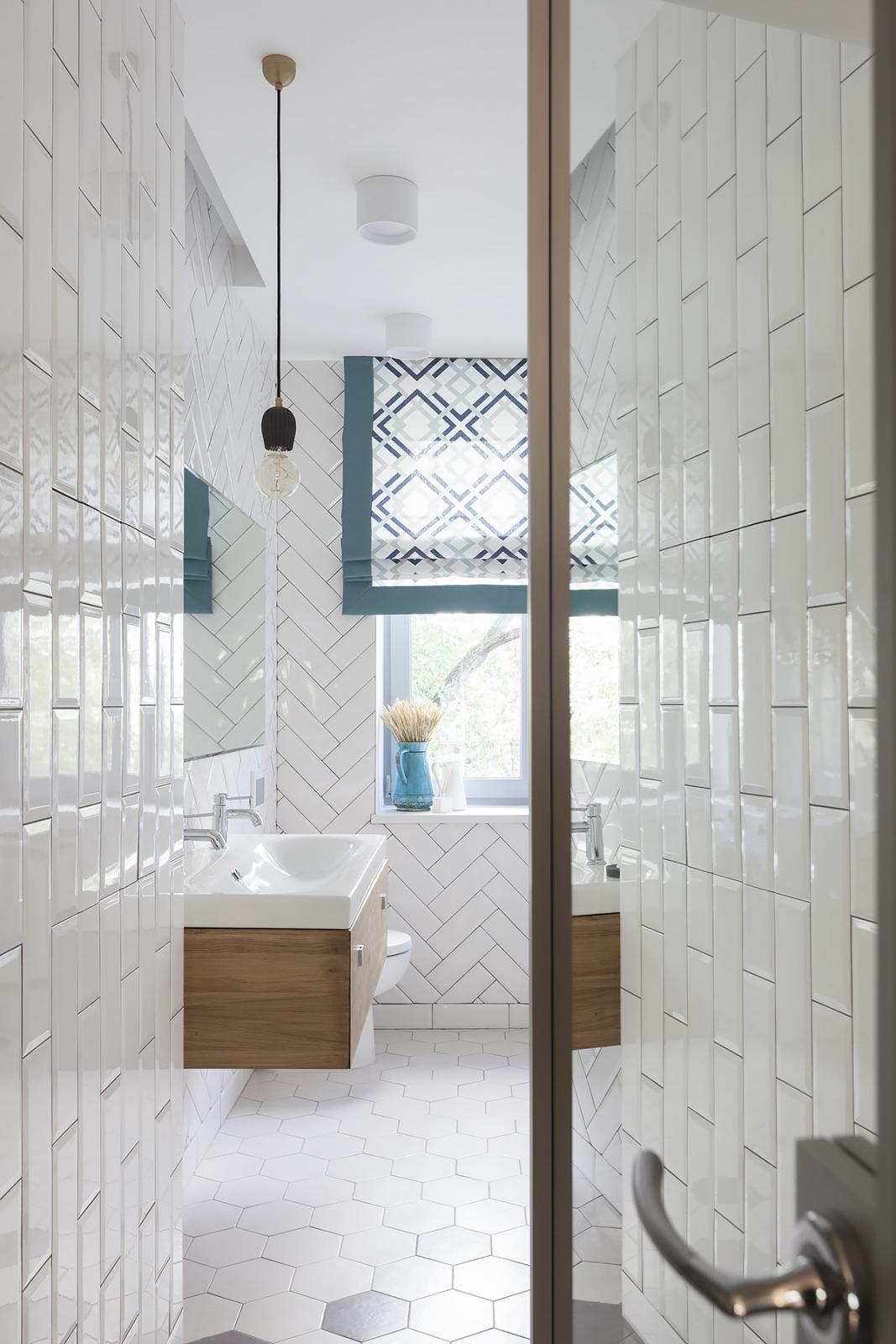 Чередование ритма на контрастных швах керамической плитки делает простую белую ванну интересной.