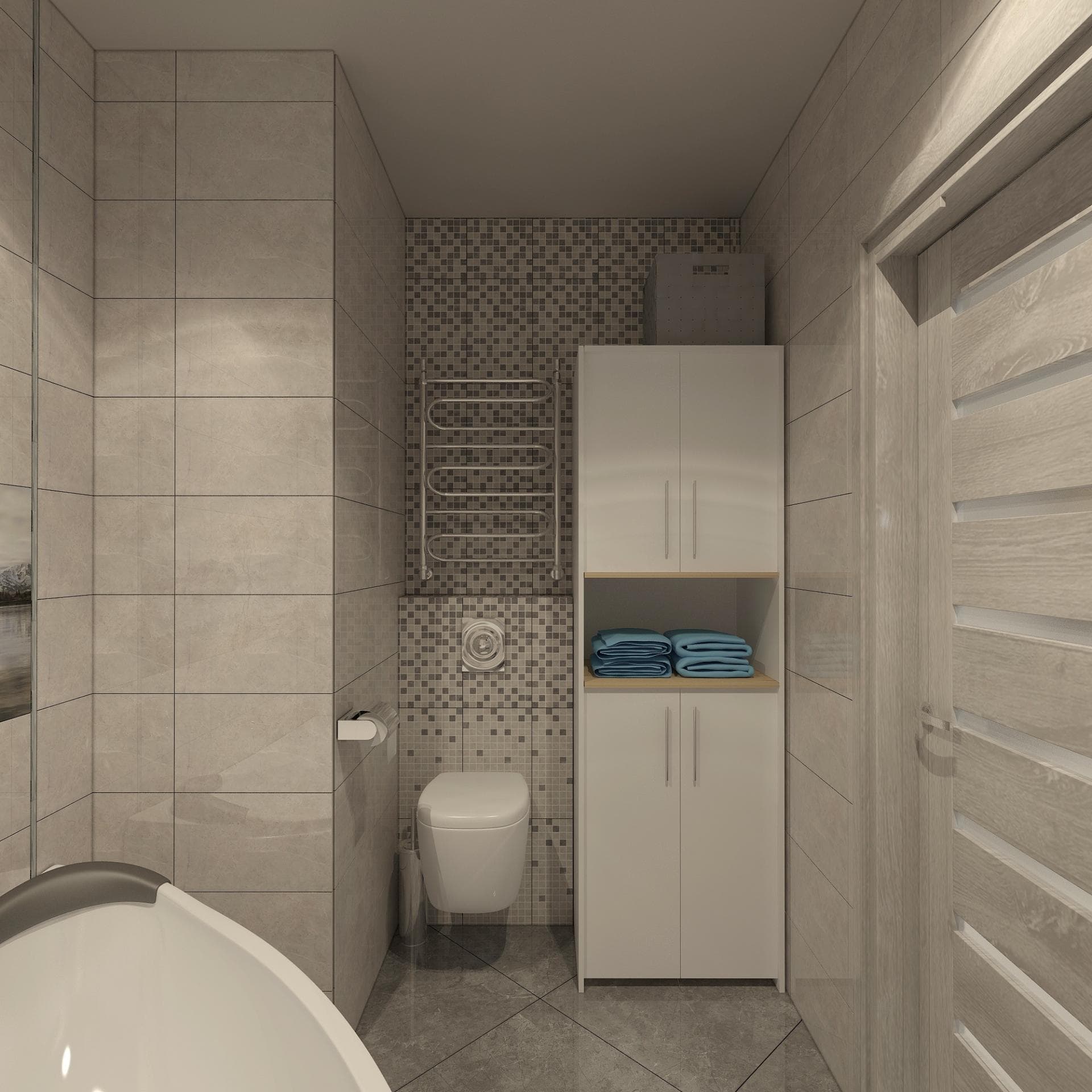 Ванную комнату заказчики захотели совмещенную, а на месте бывшего туалета решено было обустроить гардеробную. Угловая ванная вошла большая и вместительная — именно то, о чем так мечтали хозяева квартиры.