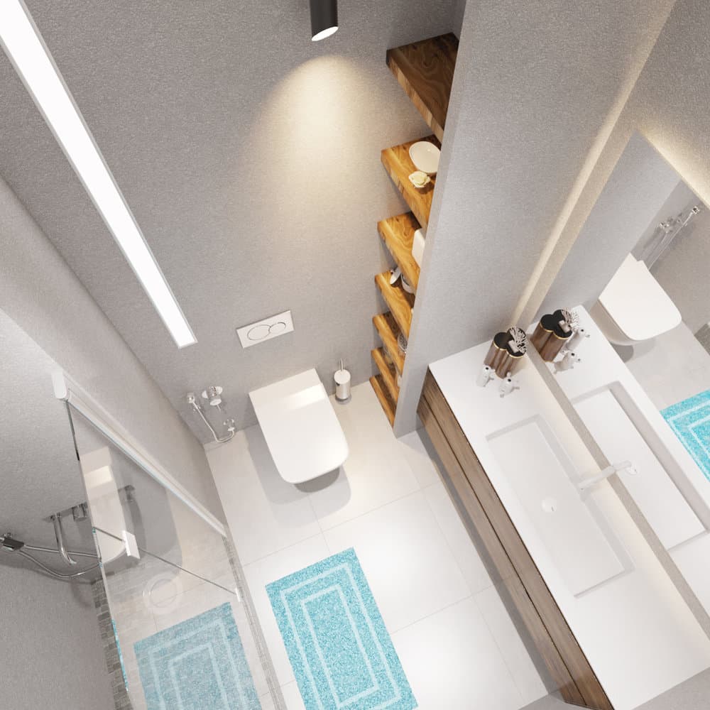 Чтобы ванная комната была свободной и удобной в использовании, входную дверь перенесли, а ванну заменили душевой кабинкой с прозрачной стеклянной перегородкой. Системы хранения ванных принадлежностей встроены под умывальник (выдвижные ящики), а стиральная машинка и вовсе вынесена в коридор и спрятана в шкаф.