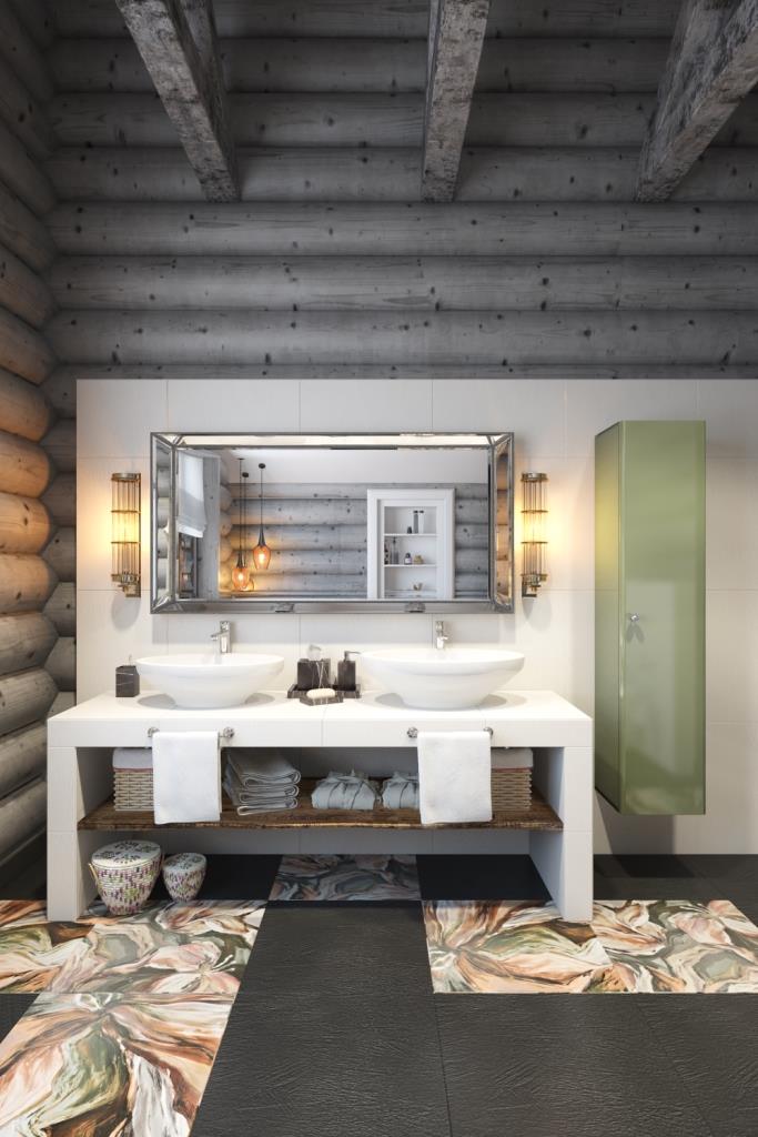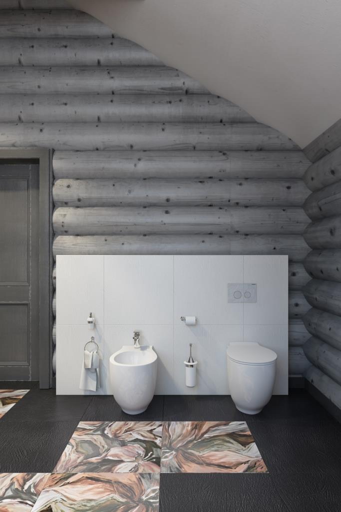 После всех изменений — эргономика и освещённость в доме стали оптимальными. Уже на этом этапе было понятно, что мы идем верным маршрутом. Далее настал этап подбора отделочных материалов, который увлёк нас не на шутку. Мы не могли себе отказать в последних тенденциях дизайна интерьеров. Плитку мы подбирали из новых коллекции прямо на выставках. Напольное покрытие, в виде чёрно-белой массивной шахматной доски, покорило нас с первого взгляда и несмотря на цены — мы не смогли устоять и это того стоило! С маслом, для защиты древесины сруба снаружи и внутри, пришлось потратить немало времени и сил, были сделаны десятки выкрасов для нахождения того единственного нужного оттенка. Зашитые участки стен были оформлены яркими нестандартными решениями. Цветовая палитра получилась широкой, и в сочетании с различными текстурами дерева, металла и керамики — интерьер получился богатым и неповторимым.