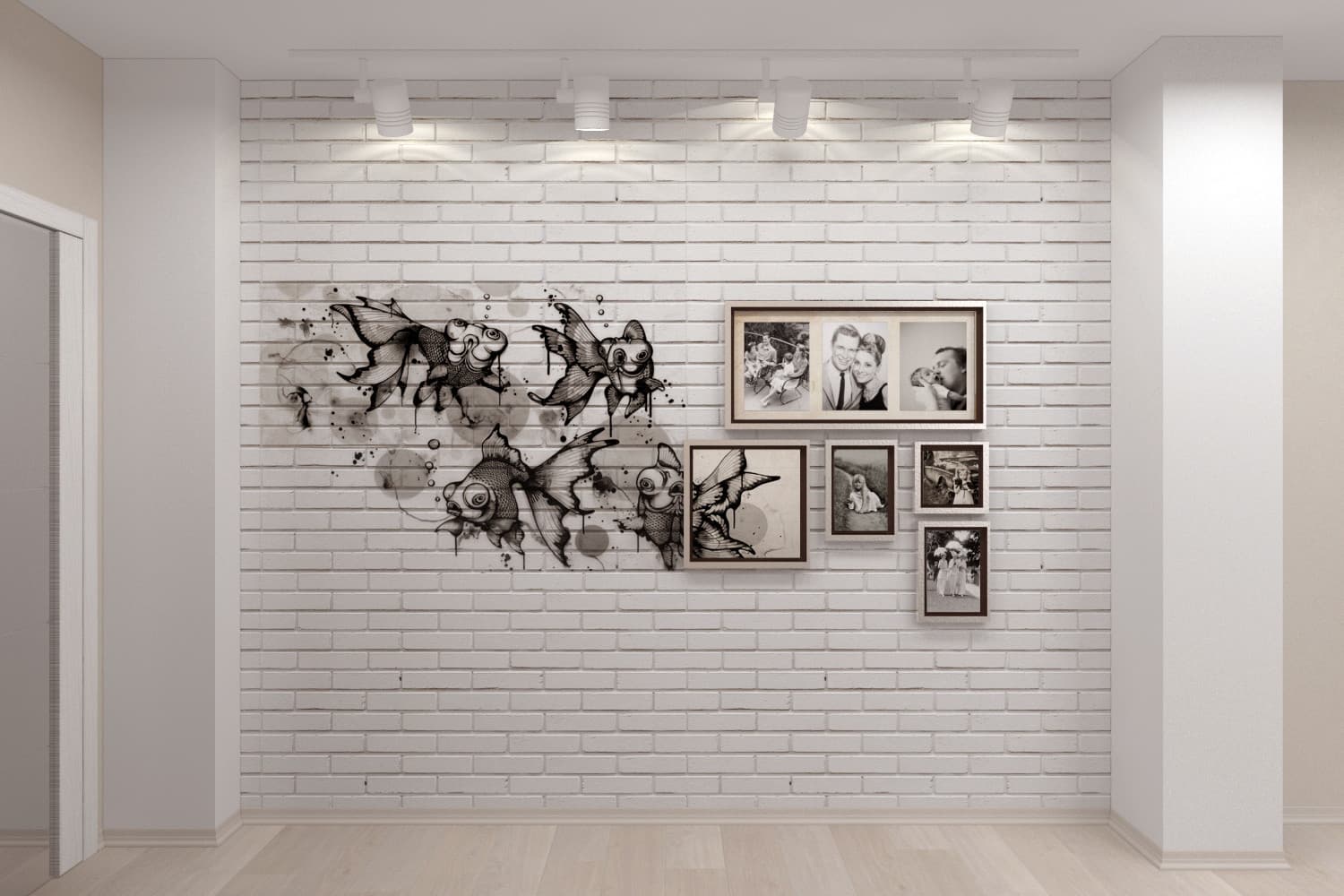 Прихожая, плавно перетекающая в гостиную. Стильный угловой шкаф, серия картин с узором и длинные светильники в едином стиле ненавязчиво украшают и разбавляют свободное пространство.