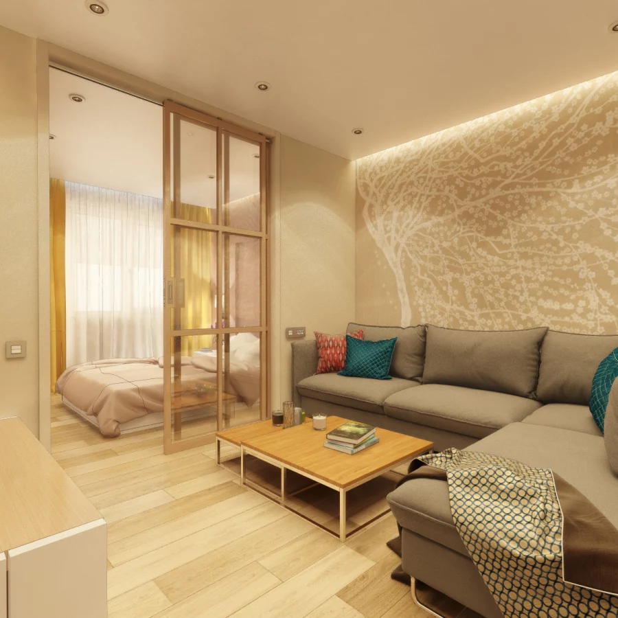 Обстановка комнаты: Спальное место, Угловой диван, Фотообои