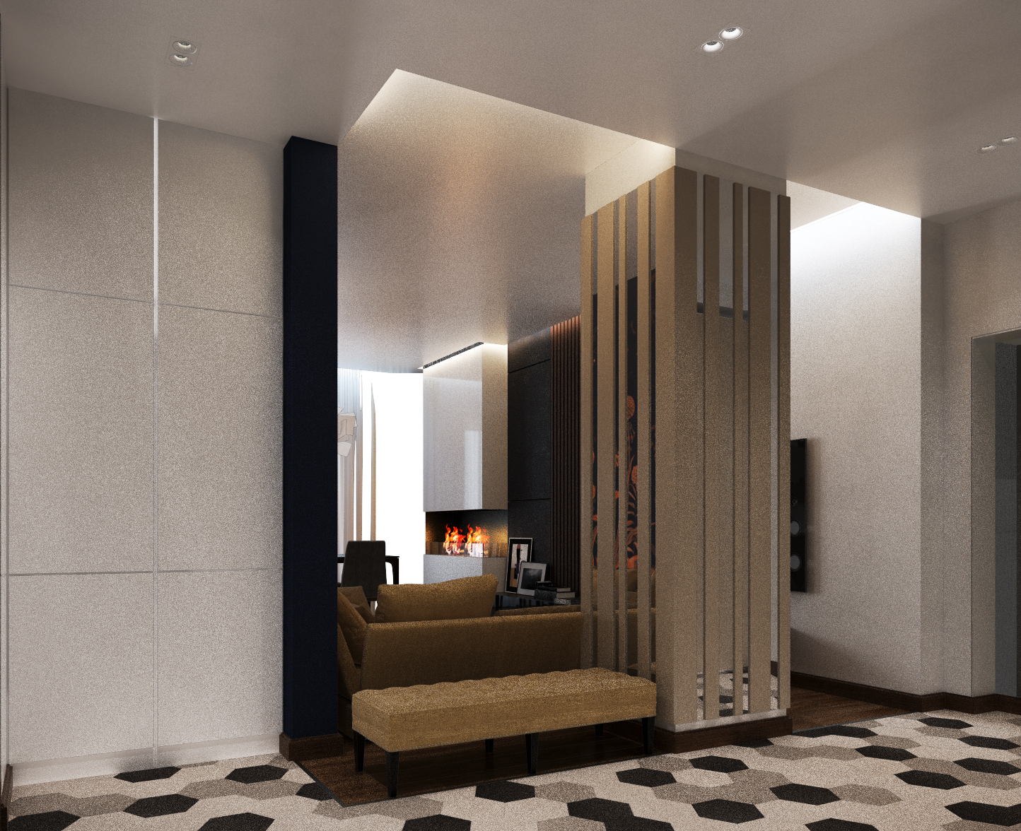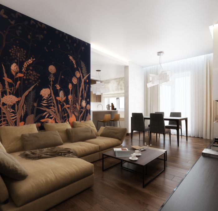 Обстановка комнаты: Камин, Угловой диван, Столовая зона, Фотообои