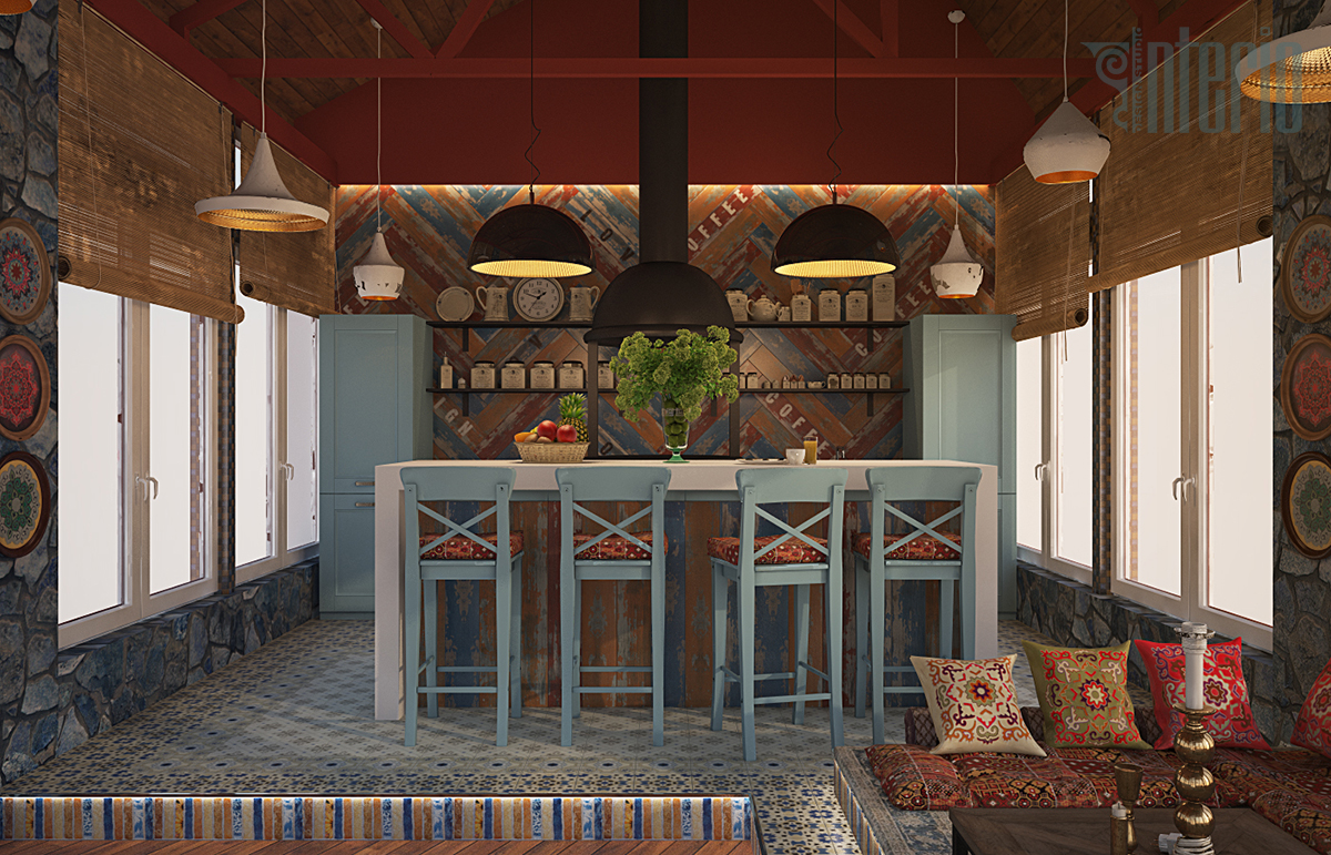 Интерьер объединенной кухни-гостиной выполнен в восточном стиле. Для облицовки пола использована керамическая плитка с этническими рисунками и дерево. Столовая зона располагается на подиуме и стилизована под чайхану. Колоритность интерьеру придают многочисленные декоративные подушки и настенные расписные тарелки. Верхняя линия кухонного гарнитура заменена открытыми полками.