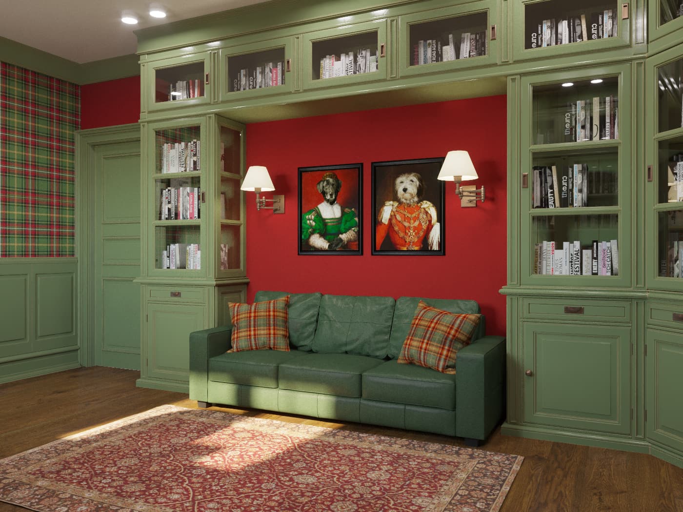Рядом с гостиной находится кабинет. Так как одно из главных увлечений хозяев коттеджа — чтение, огромный книжный шкаф (выполненный на заказ), занимает фактически две стены помещения. Достаточно тяжелые для комбинирования базовые оттенки интерьера — сочный красный и болотно-зеленый — уравновешивает акцентная стена-”штоландка”, делая их сочетание сдержанным и интересным.