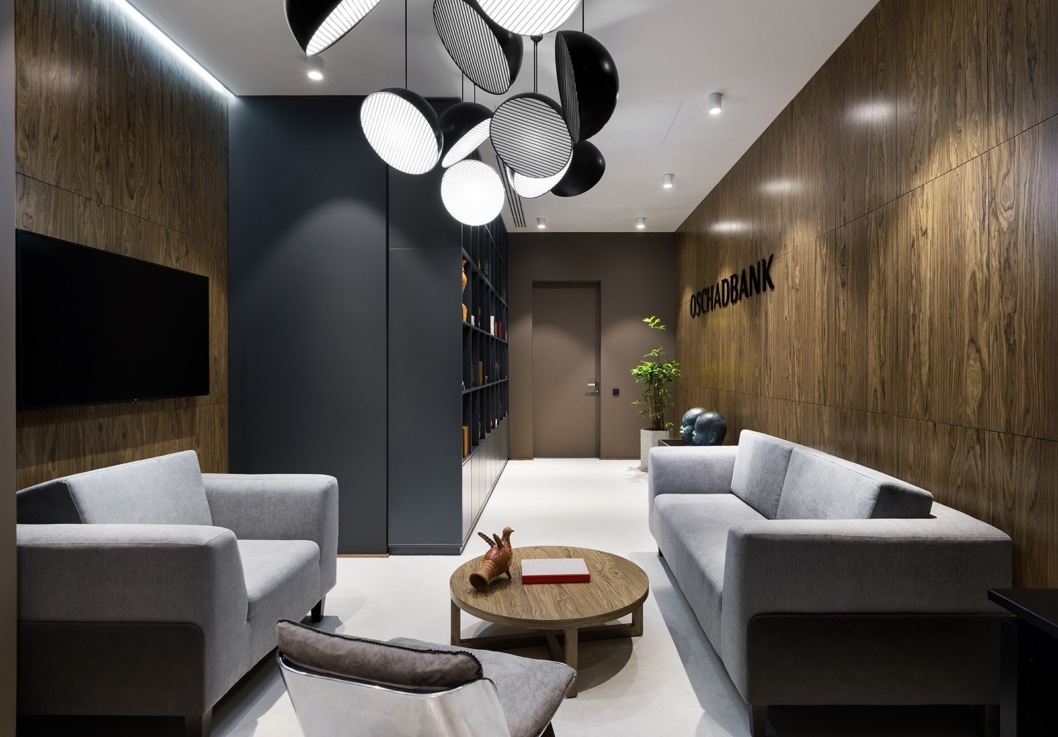 Ключевыми материалами в создании интерьера офиса стали мрамор, бетон и дерево.