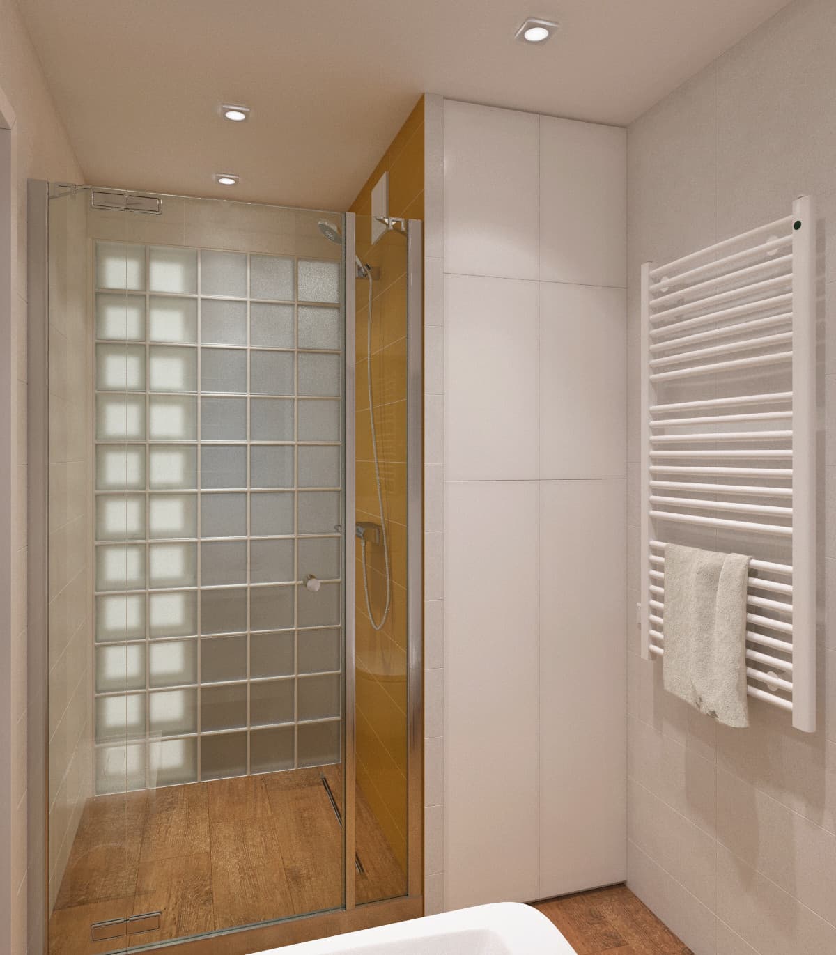 Отличительная особенность, главный декоративный элемент и дополнительный источник естественного освещения этого санузла – перегородка из стеклянных блоков, отделяющая его от кухни.