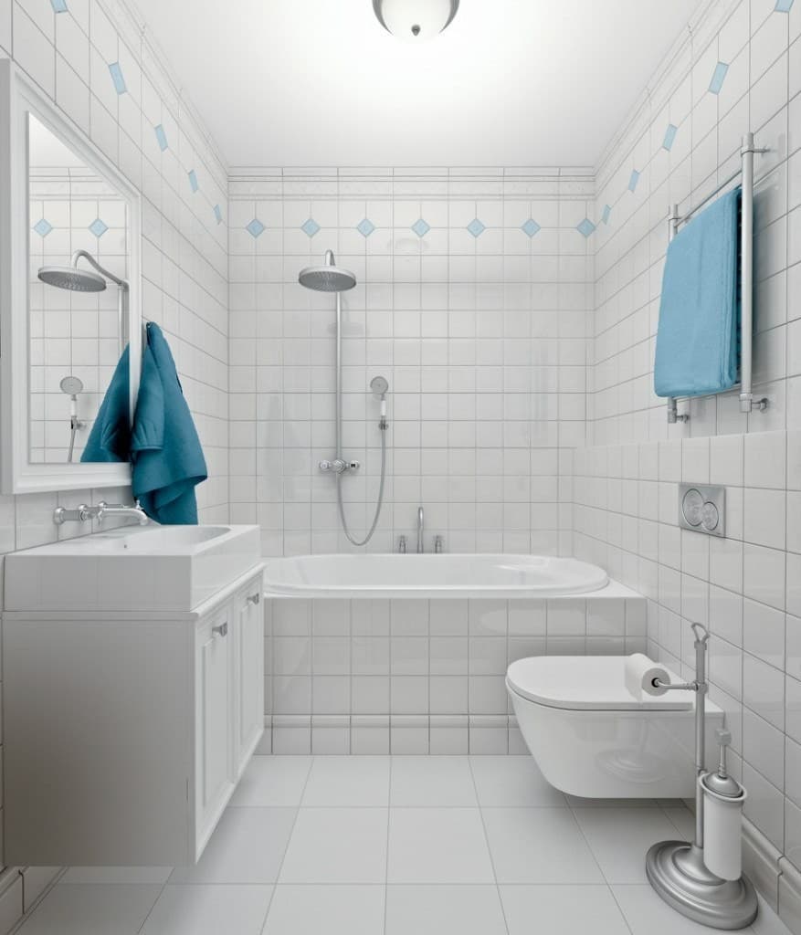 Ванная с простым белым кафелем создает ощущение кристальной чистоты.