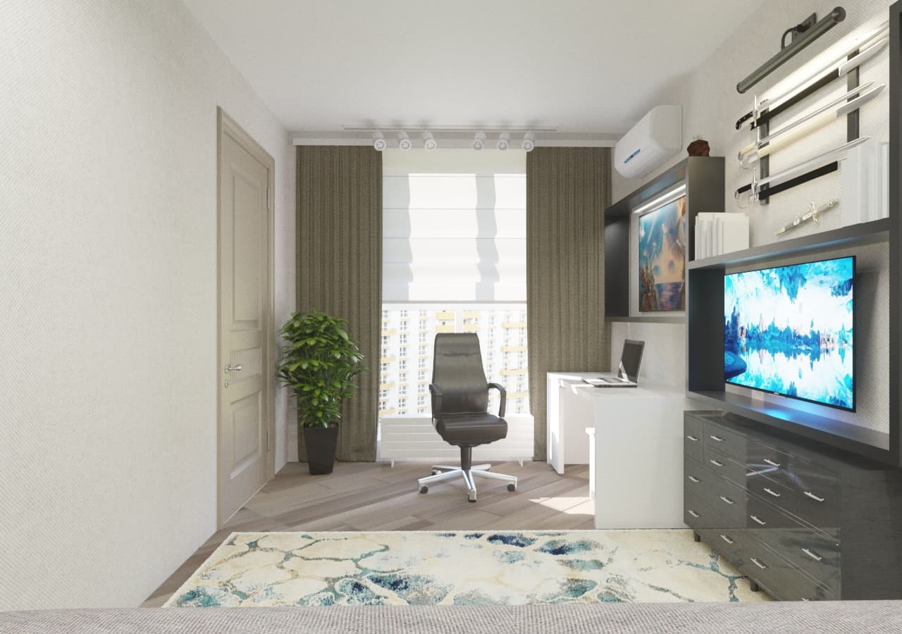 Интерьер гостевой спальни построен на контрасте светлых оттенков и темной серо-коричневой палитры. Темная акцентная стена у изголовья кровати плавно перетекает в потолок, тем самым визуально отделяя зону сна от остальной части комнаты. Во второй, более светлой, половине помещения обустроено рабочее место. Сдержанная палитра цветов спальни разбавлена бело-синим ненавязчивым принтом ковра и резонирующими с ним оттенками картины над рабочим столом. Изюминку дизайну придает коллекция сабель над тумбой с ТВ.