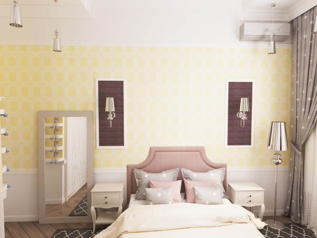 Интерьер этой спальни вышел очень мягким и женственным. Желтые обои с повторяющимся рисунком визуально делают комнату просторнее, чем она есть на самом деле. Вместо шкафа-купе обустроена компактная гардеробная. Её дверцы идеально сочетаются с полотном межкомнатных дверей. Мягкое розовое изголовье кровати отлично оттеняется более темными панелями с бра. Главными декоративным элементом интерьера стала коллекция куколок возле двери. Металлический глянцевые светильники подобраны из одной коллекции.