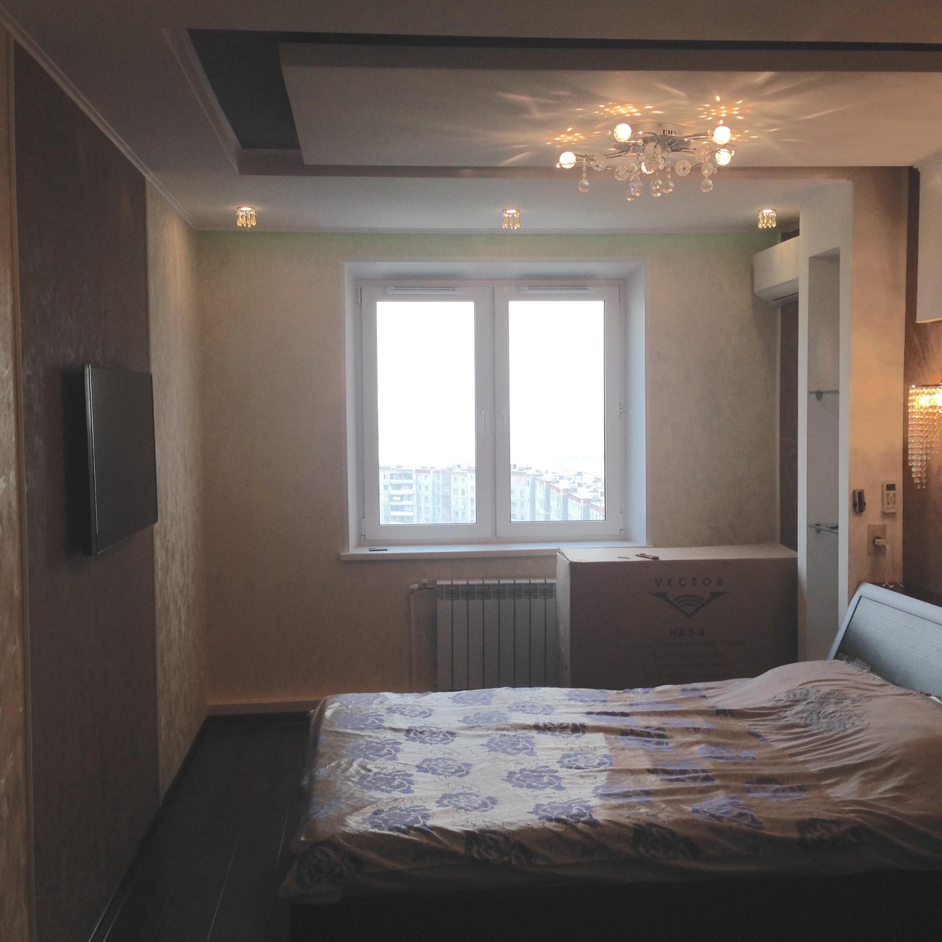 Спальня с угловым шкафом и этажерками, у окна оборудована рабочая зона. Первые два изображения – визуализация от дизайнера, последующие – реализация.