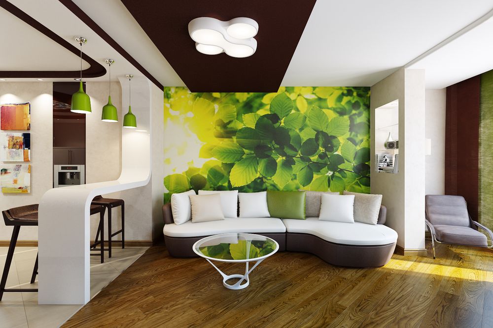Обстановка комнаты: Спальное место, Угловой диван, Столовая зона, Фотообои
