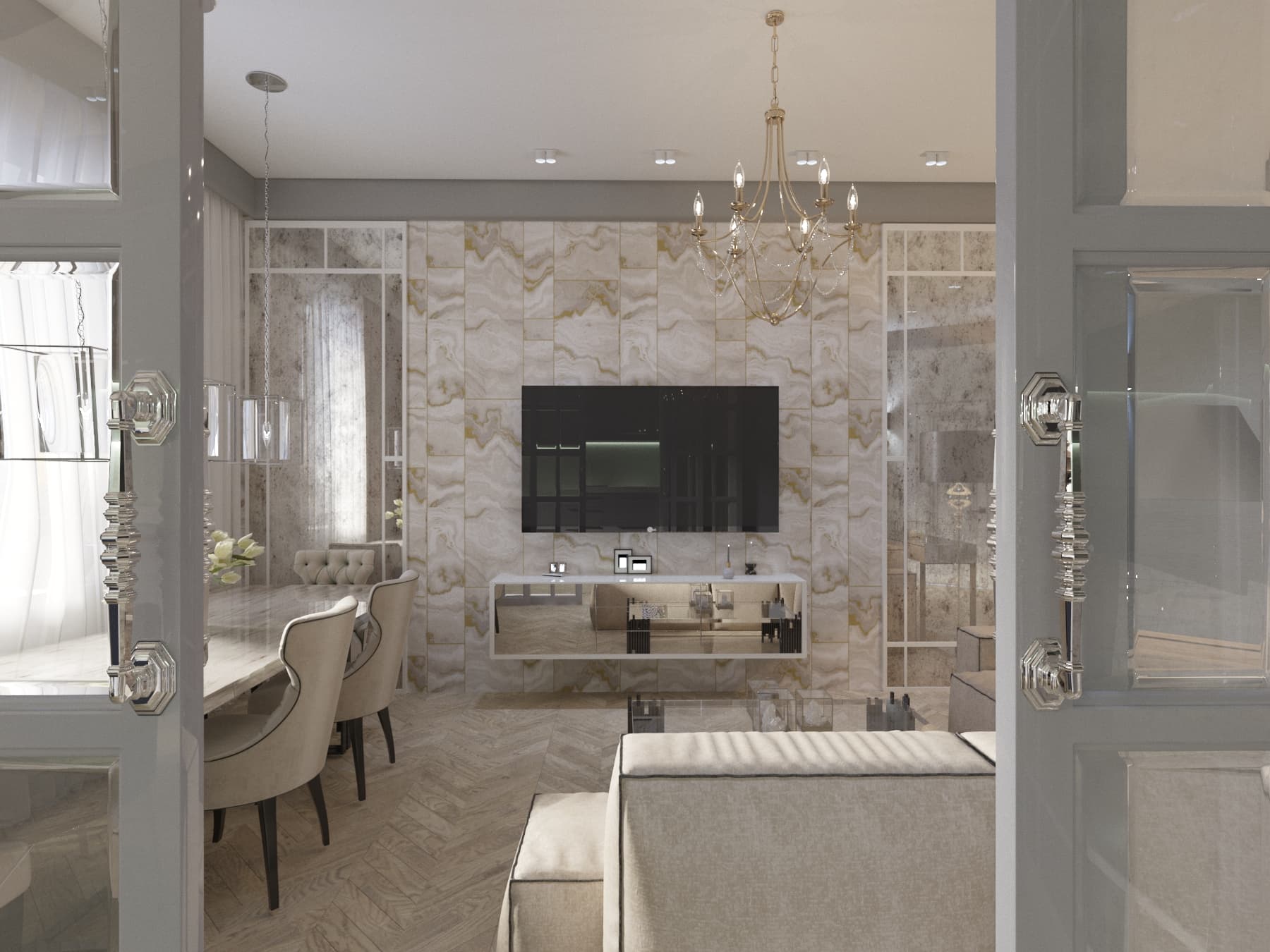 Канонический классический стиль интерьера этой гостиной приобрел совершенно иное трактование благодаря изобилию зеркальных поверхностей и стеклянных элементов. Монохромность и сдержанность светлой палитры интерьера оттеняется и текстурируется синими панелями дальней стены и многоуровневым освещением. Для отделки акцентной стены использовались плитки из светлого мрамора и стеклянные глянцевые панели. Из стекла также выполнены журнальные столик и ножки торшеров, а из зеркал — фасады подвесной тумбы под телевизором и платяного шкафа в углу, а также миниатюрное бюро перед диваном. Одну из стен почти полностью заменили стеклянные раздвижные двери, а возле окна размещается большой обеденный стол для семейных праздников и торжеств.
